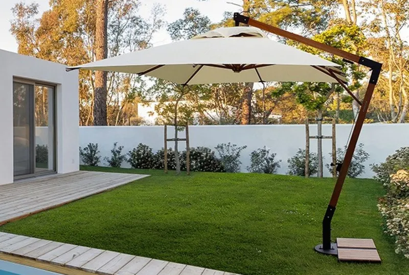 STRUTTURA IN LEGNO VERNICIATO COLOR TEAK A BASE DI NITROCELLULOSA. PALO 93X93 MM, 8 STECCHE 20X35 MM, CON FINALI IN ALLUMINIO E INSERTI IN PELLE. CORONA IN LEGNO. BASE LATERALE IN ACCIAIO. PALO GIREVOLE MANUALMENTE 180°. TELO IN POLIESTERE 270GR/M2 COLORE ECRU’ CON RIVESTIMENTO IN PA (POLIAMMIDE) CON CAMINO ANTIVENTO. MARMETTE NON INCLUSE. SI RACCOMANDA L’USO DI ALMENO 4 MARMETTE