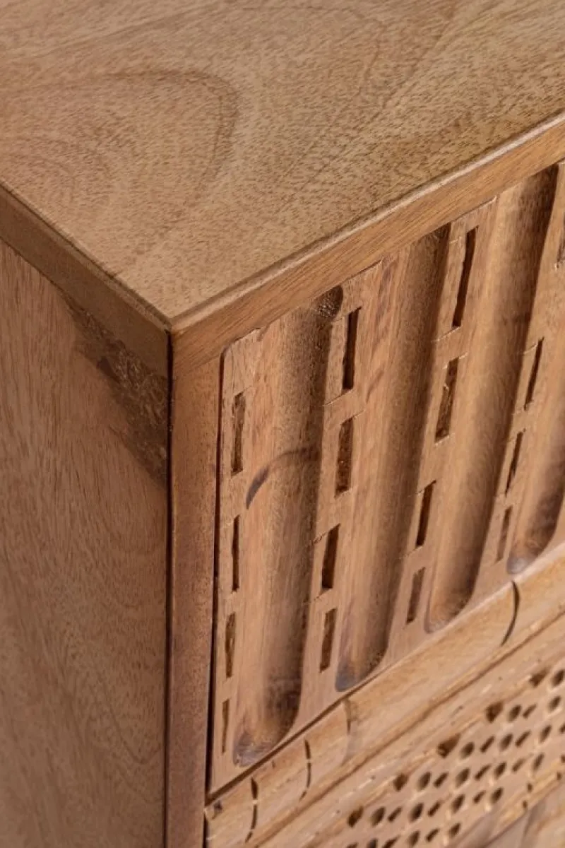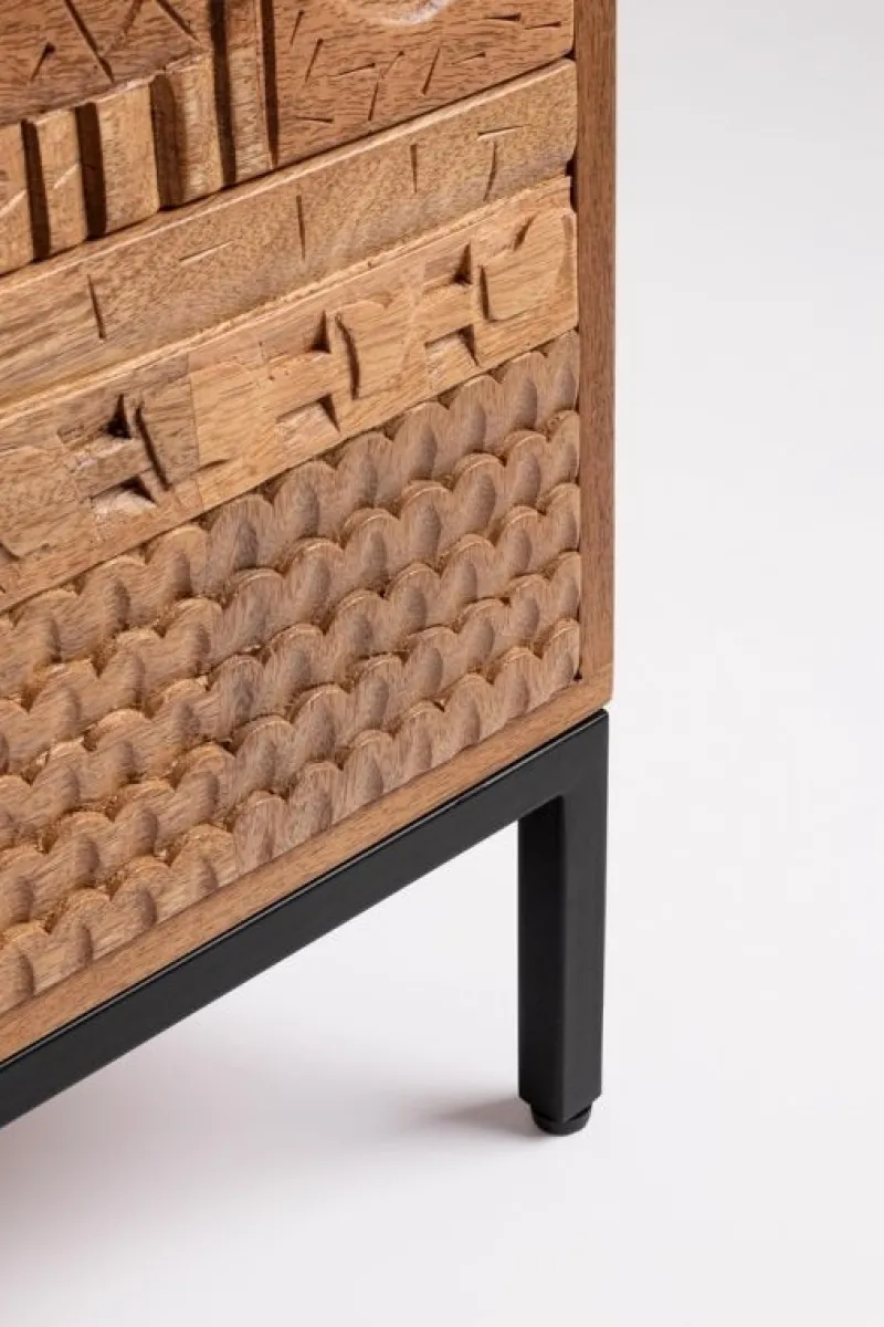 STRUTTURA IN LEGNO MANGO MASSICCIO, SCHIENALE IN MDF. VERNICIATURA A BASE DI NITROCELLULOSA. GAMBE E MANIGLIE IN ACCIAIO. FRONTALE CASSETTI ED ANTE INTARSIATI E LAVORATI A MANO. GAMBE DA ASSEMBLARE.