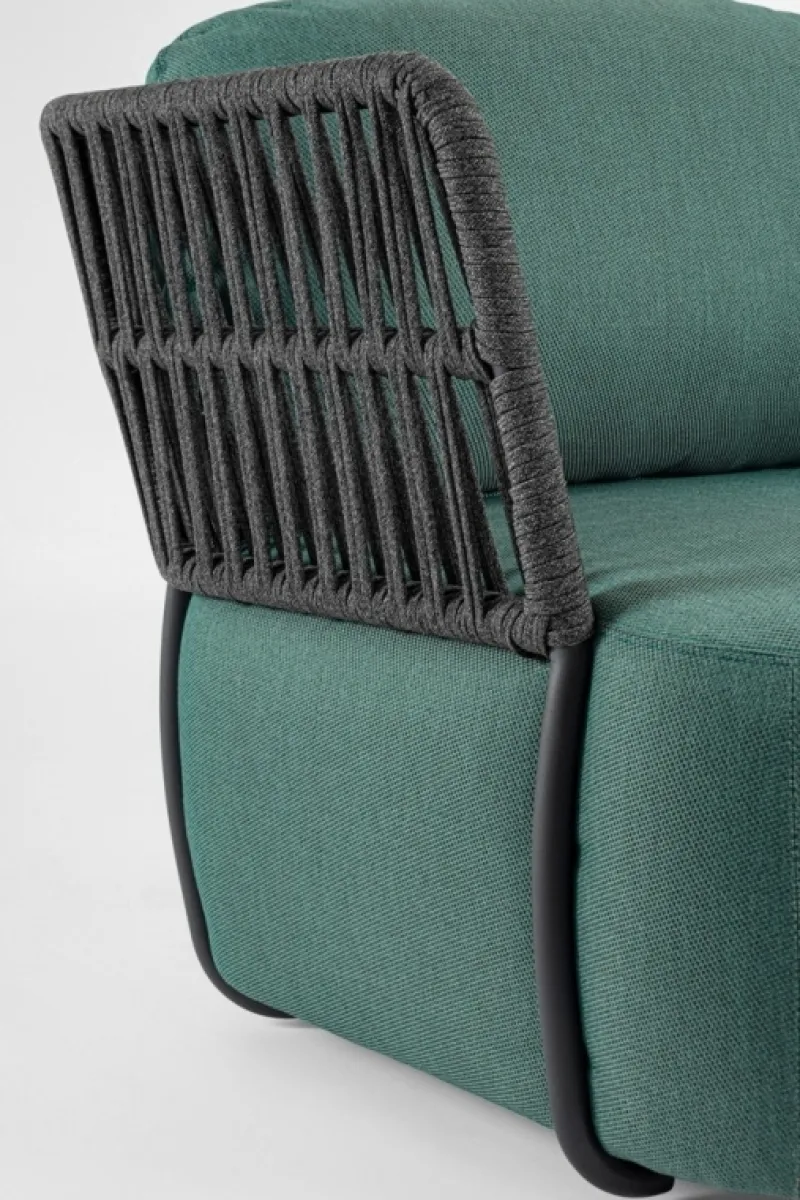 STRUTTURA IN ALLUMINIO VERNICIATO A POLVERE (POLIESTERE). INTRECCIO IN CORDA OLEFIN (100% POLIPROPILENE). SEDUTA CON IMBOTTITURA IMPERMEABILE, RIVESTIMENTO NON SFODERABILE IN TESSUTO PER ESTERNO IN OLEFIN (100% POLIPROPILENE, 285G/M2),IDROREPELLENTE E RESISTENTE AI RAGGI UV (GRADO 7). CUSCINO SCHIENALE SFODERABILE IN TESSUTO OLEFIN.