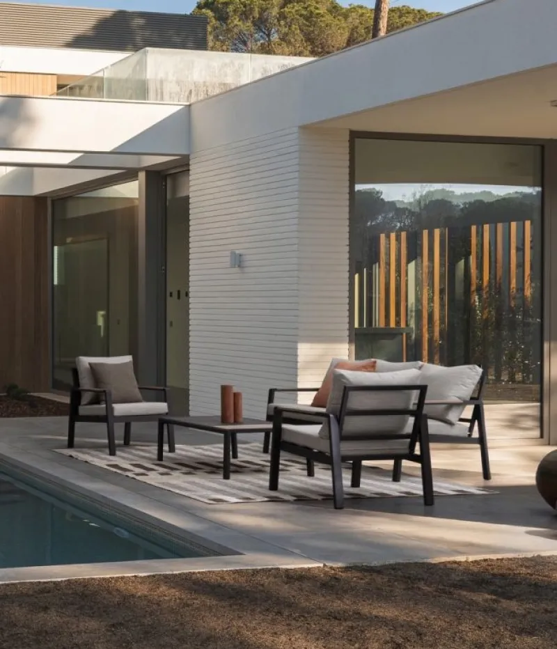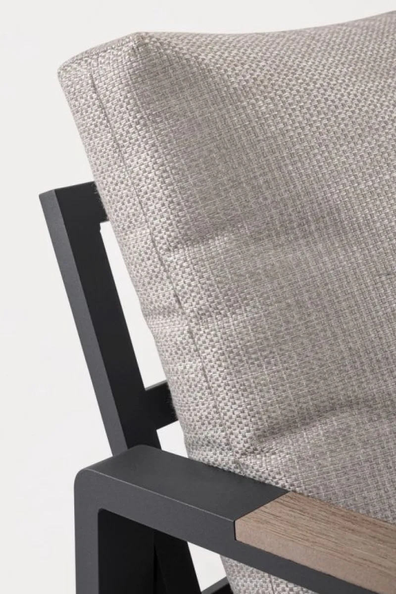 STRUTTURA IN ALLUMINIO, VERNICIATO A POLVERE (POLIESTERE). BRACCIOLI E PIANO TAVOLINO CON INSERTI IN POLYWOOD. CUSCINI SFODERABILI CON TESSUTO IDROREPELLENTE SPUN POLY (POLIESTERE). DA ASSEMBLARE.