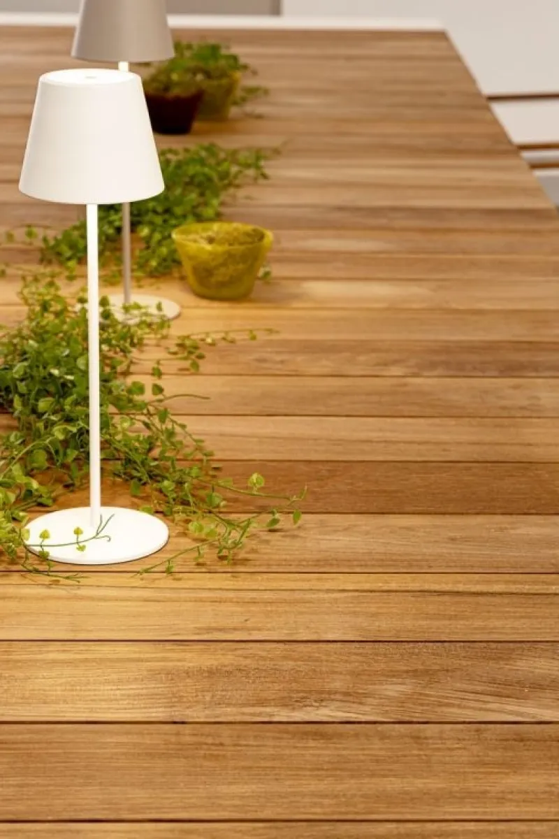 STRUTTURA IN ALLUMINIO, VERNICIATO A POLVERE (POLIESTERE). PIANO IN TEAK. ALLUNGABILE CON APERTURA TELESCOPICA. PROLUNGHE ESTERNE CON ALLOGGIO SOTTO IL PIANO. VITERIA IN ACCIAIO INOSSIDABILE. PIEDINI IN PLASTICA REGOLABILI. GAMBE DA ASSEMBLARE. ATTENZIONE CODICE IN ABBINAMENTO.