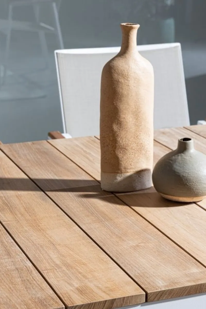 STRUTTURA IN ALLUMINIO, VERNICIATO A POLVERE (POLIESTERE). PIANO IN TEAK. VITERIA IN ACCIAIO INOSSIDABILE. GAMBE DA ASSEMBLARE.