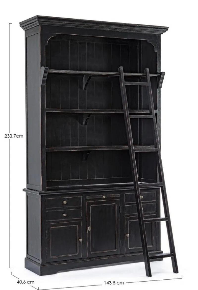 STRUTTURA IN LEGNO DI MANGO, SCHIENALI E LATERALI IN MDF. SCALA DECORATIVA IN MANGO. FINITURA DECAPATA ED ANTICATA A BASE DI NITROCELLULOSA. MANIGLIE IN GHISA.