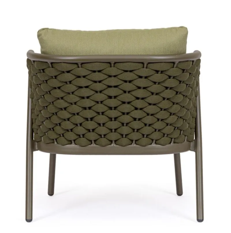 STRUTTURA IN ALLUMINIO VERNICIATO A POLVERE (POLIESTERE). INTRECCIO IN CORDA DI TEXTILENE CON IMBOTTITURA IN GOMMA NITRILICA. CUSCINO SEDUTA E SCHIENALE SFODERABILE IN TESSUTO IDROREPELLENTE OLEFIN (100% POLIPROPILENE).