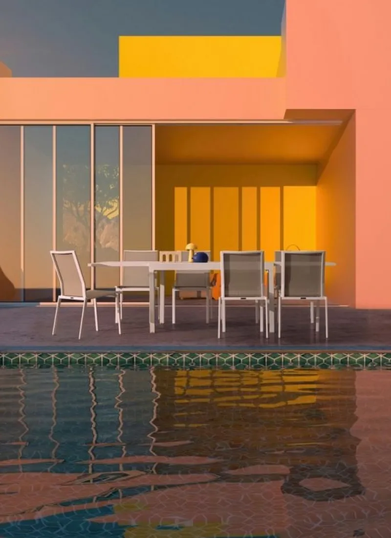 STRUTTURA IN ALLUMINIO, VERNICIATO A POLVERE (POLIESTERE). SEDUTA E SCHIENALE RIVESTITI IN TEXTILENE PHIFER 1X1. IMPILABILE. IMBALLO SENZA CARTONE.