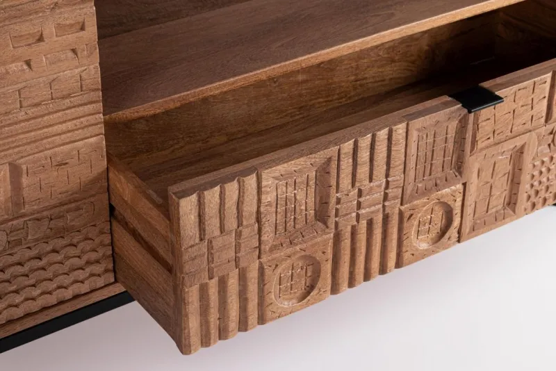 STRUTTURA IN LEGNO MANGO MASSICCIO, SCHIENALE IN MDF. VERNICIATURA A BASE DI NITROCELLULOSA. GAMBE E MANIGLIE IN ACCIAIO. FRONTALE CASSETTI ED ANTE INTARSIATI E LAVORATI A MANO. VANO PORTA COMPRENSIVO DI MENSOLA. GAMBE DA ASSEMBLARE.