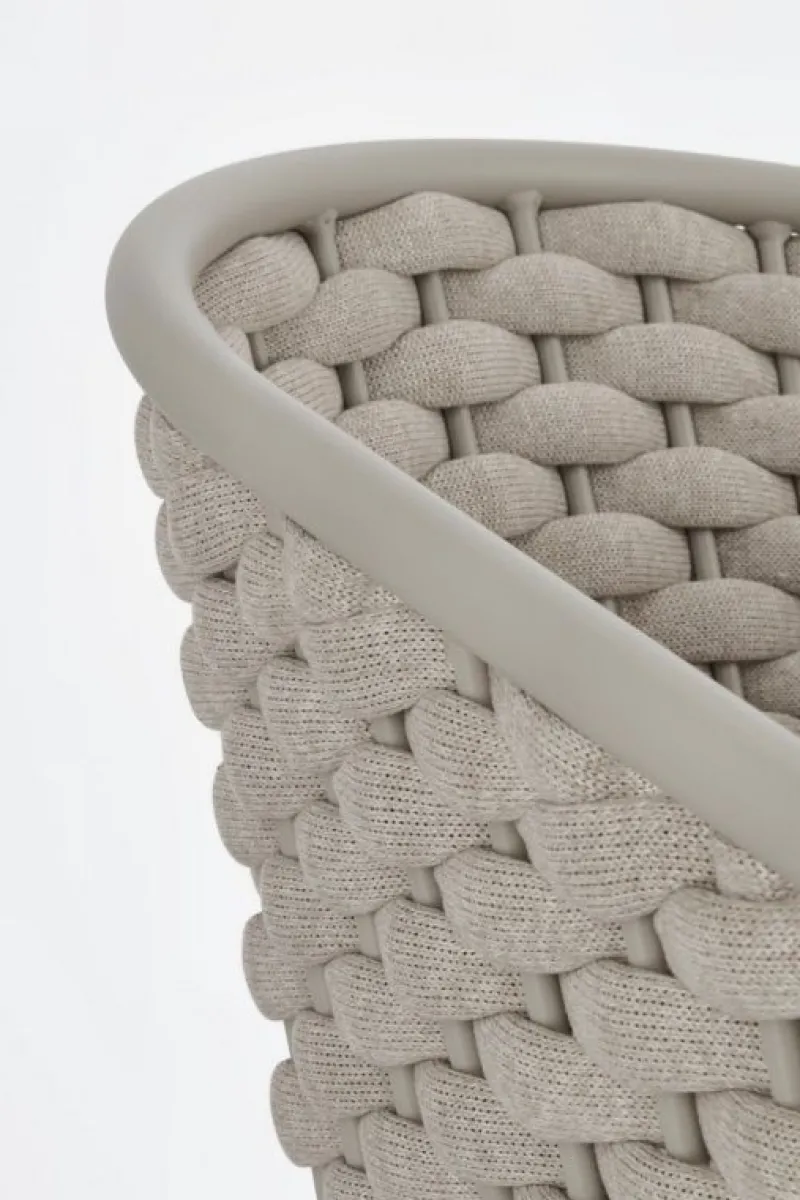 STRUTTURA IN ALLUMINIO VERNICIATA A POLVERE (POLIESTERE). INTRECCIO PER ESTERNO IN CORDA POLIESTERE IMBOTTITA IN GOMMA (POLIETILENE). CUSCINI SFODERABILI IN TESSUTO IDROREPELLENTE 100% POLIESTERE. IMPILABILE. IMBALLO SENZA CARTONE.