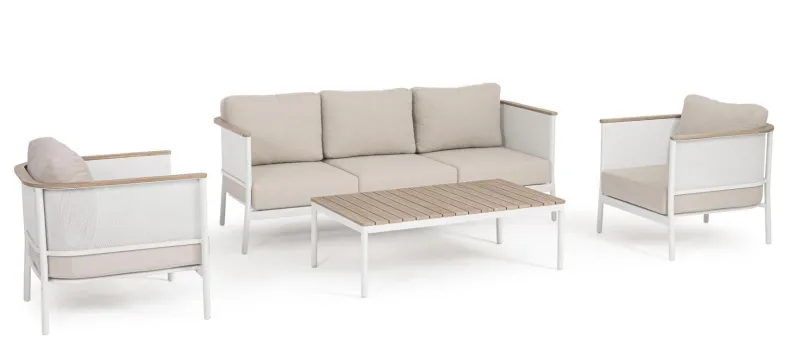 STRUTTURA IN ALLUMINIO VERNICIATO A POLVERE (POLIESTERE). BRACCIOLI E PIANO TAVOLINO IN ALLUMINIO CON VERNICIATURA EFFETTO LEGNO. CUSCINI SEDUTA E SCHIENALE SFODERABILI CON TESSUTO IDROREPELLENTE OLEFIN (100% POLIPROPILENE). GAMBE TAVOLINO (VITERIA IN ACCIAIO INOSSIDABILE) DA ASSEMBLARE.