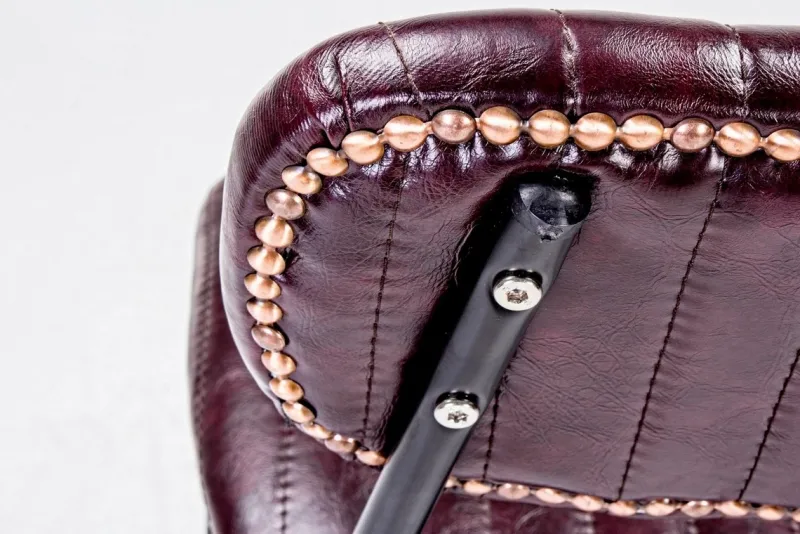 STRUTTURA IN ACCIAIO VERNICIATO A POLVERE EPOSSIDICA, RIVESTIMENTO IN SIMILPELLE. SCHIENALE CON APPLICAZIONE DI BORCHIE IN METALLO. DENSITA’IMBOTTITURA IN SCHIUMA POLIURETANICA SEDUTA E SCHIENALE 21KG/M3.