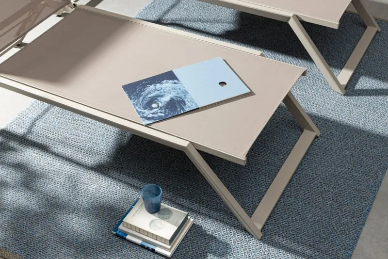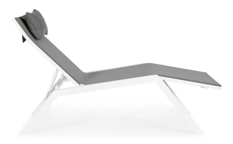 STRUTTURA IN ALLUMINIO VERNICIATA A POLVERE (POLIESTERE). RIVESTIMENTO IN TEXTILENE 1X1. SCHIENALE RECLINABILE IN 3 POSIZIONI. CUSCINO POGGIATESTA CON IMBOTTITURA PER ESTERNO FAST DRY FOAM, REMOVIBILE E SFODERABILE. VITERIA IN ACCIAIO INOSSIDABILE. DA ASSEMBLARE