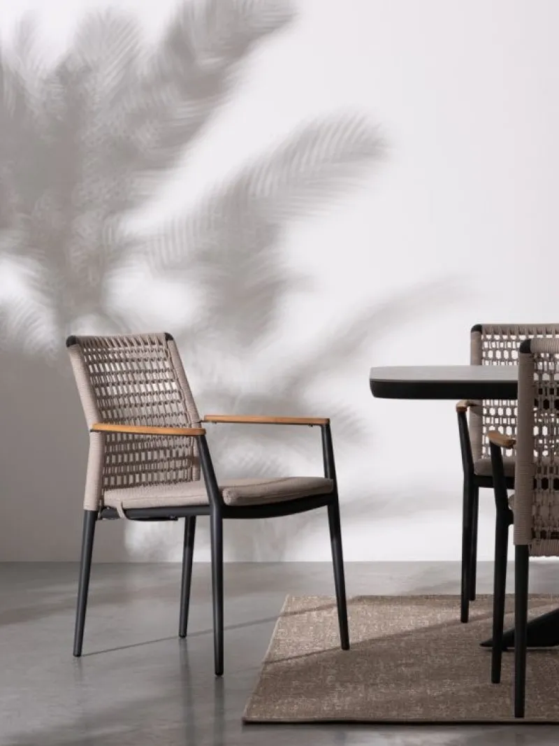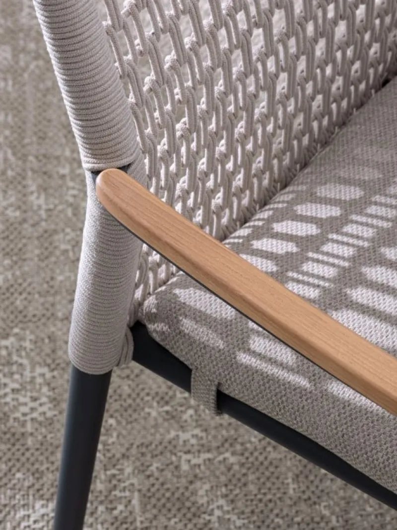 STRUTTURA IN ALLUMINIO VERNICIATA A POLVERE (POLIESTERE).BRACCIOLI CON INSERTI IN TEAK. INTRECCIO IN CORDA OLEFIN. CUSCINO SFODERABILE CON TESSUTO IDROREPELLENTE OLEFIN (100% POLIPROPILENE). IMPILABILE. NON VENDIBILE IN GERMANIA, AUSTRIA, SVIZZERA, PAESI BASSI E LUSSEMBURGO.