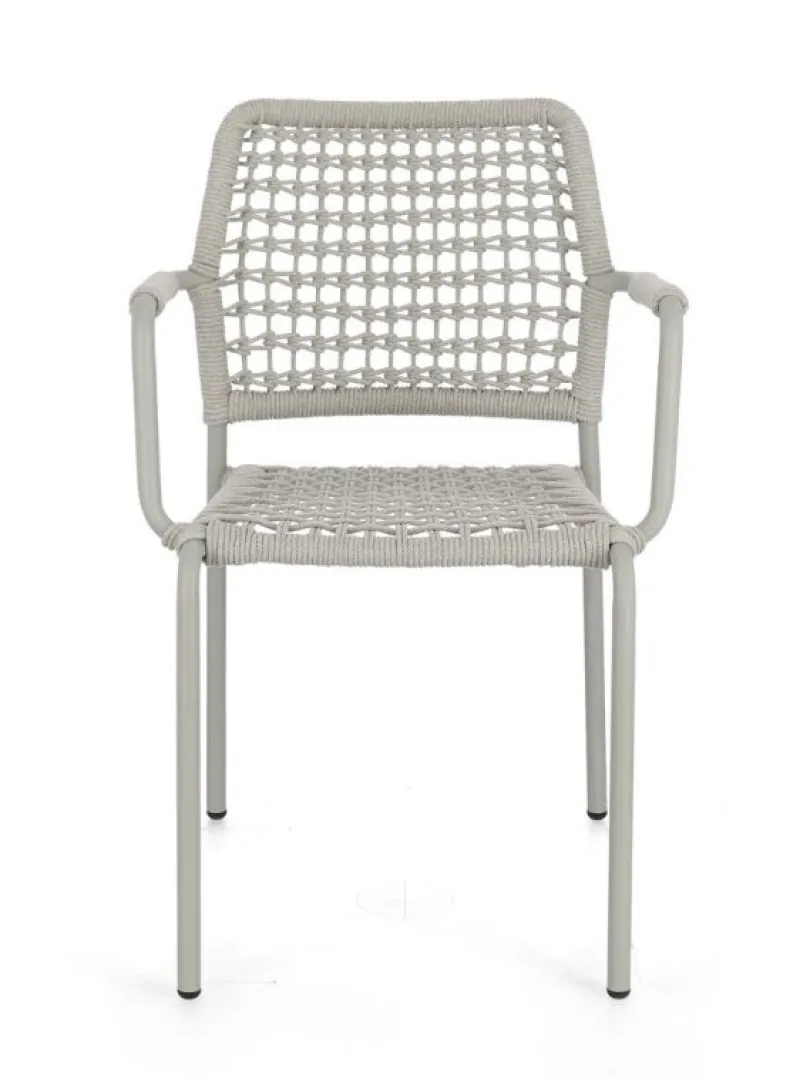 STRUTTURA IN ALLUMINIO VERNICIATA A POLVERE (POLIESTERE). INTRECCIO PER ESTERNO IN CORDA POLIESTERE. IMPILABILE.