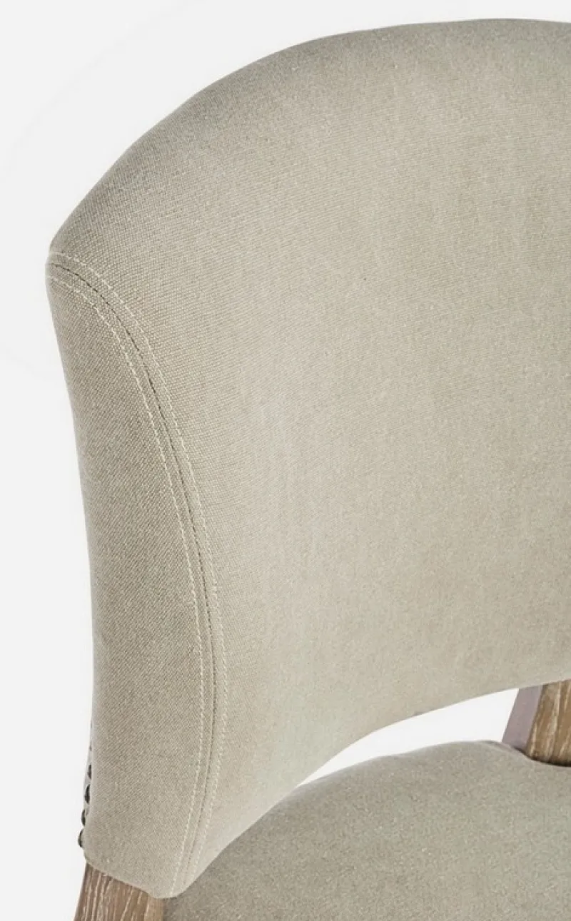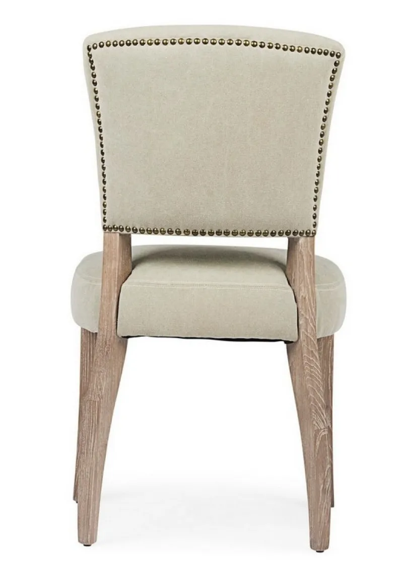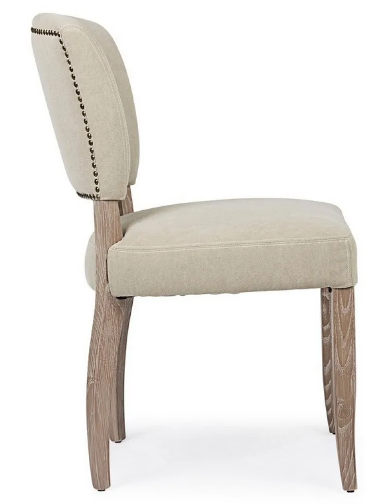 STRUTTURA IN LEGNO DI FRASSINO CON FINITURA A BASE DI NITROCELLULOSA, RIVESTIMENTO IN TESSUTO (15% POLIESTERE 85% COTONE). SCHIENALE CON APPLICAZIONE DI BORCHIE IN METALLO. IMBOTTITURA IN SCHIUMA POLIURETANICA DENSITA’ SEDUTA 30KG/M3, SCHIENALE 25KG/M3.
