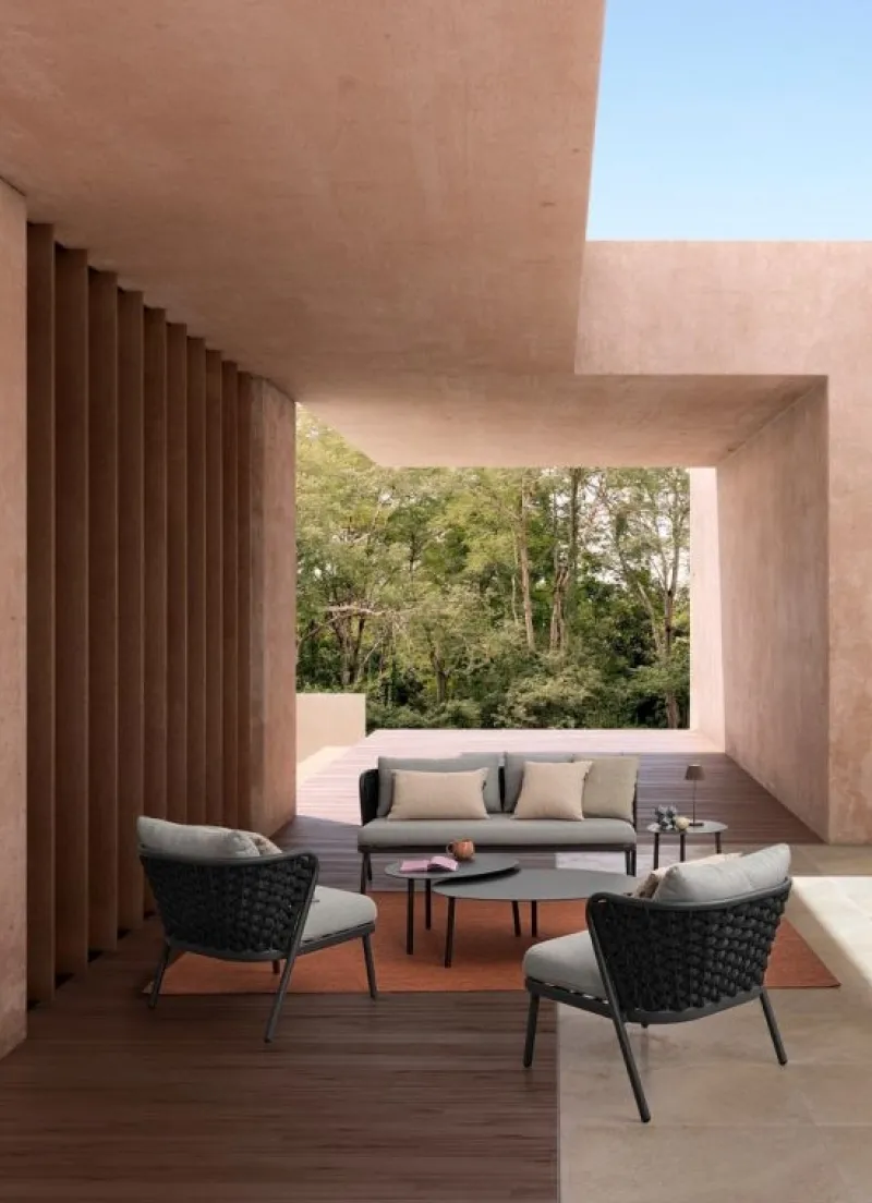 STRUTTURA IN ALLUMINIO VERNICIATO A POLVERE (POLIESTERE). INTRECCIO IN CORDA DI TEXTILENE CON IMBOTTITURA IN GOMMA NITRILICA. CUSCINO SEDUTA E SCHIENALE SFODERABILE IN TESSUTO IDROREPELLENTE OLEFIN (100% POLIPROPILENE).