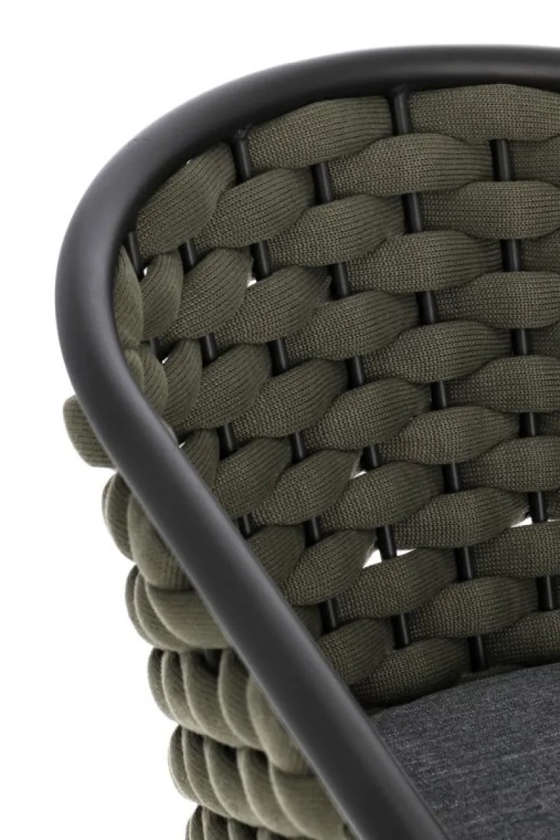 STRUTTURA IN ALLUMINIO VERNICIATA A POLVERE (POLIESTERE). INTRECCIO PER ESTERNO IN CORDA OLEFIN (POLIPROPILENE) IMBOTTITA IN GOMMA (POLIETILENE). CUSCINI SFODERABILI IN TESSUTO IDROREPELLENTE 100% POLIPROPILENE. IMPILABILE.