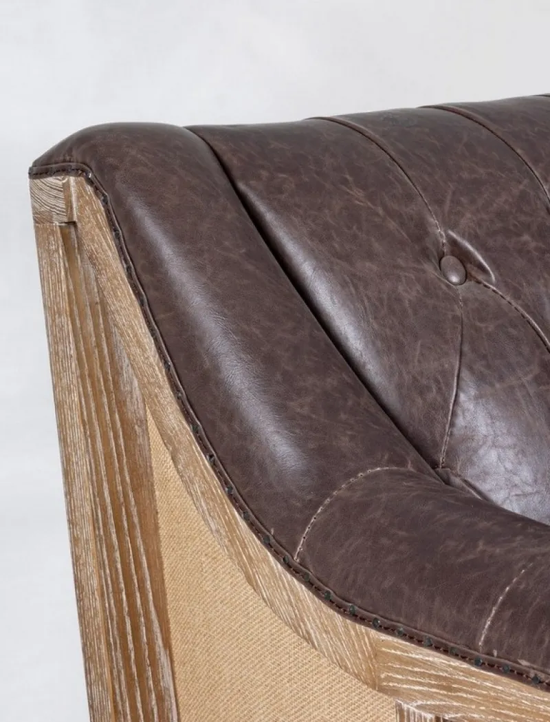 STRUTTURA E SCHIENALE IN LEGNO DI FRASSINO, RIVESTIMENTO (NON SFODERABILE) IN SIMILPELLE. IMBOTTITURA IN SCHIUMA POLIURETANICA SEDUTA (DENSITA’ 30KG/M3), SCHIENALE (DENSITA’ 25KG/M3).