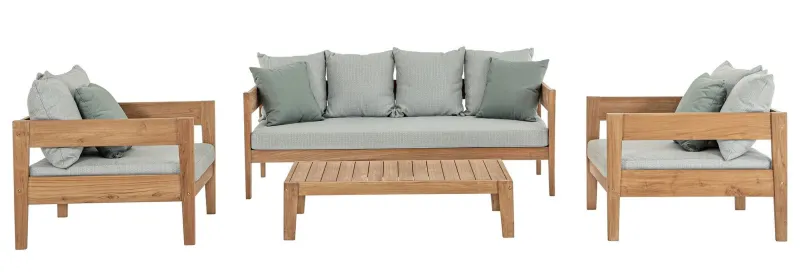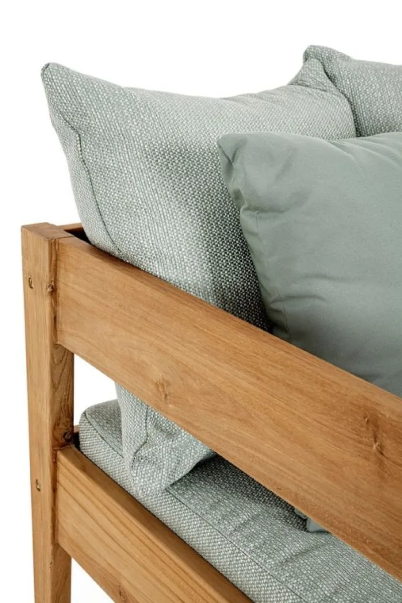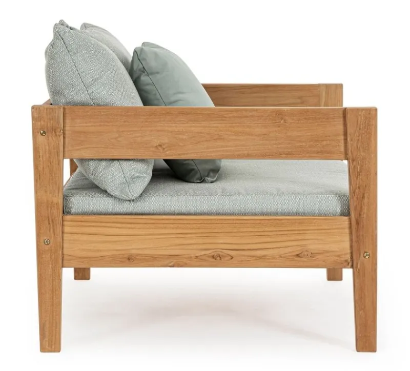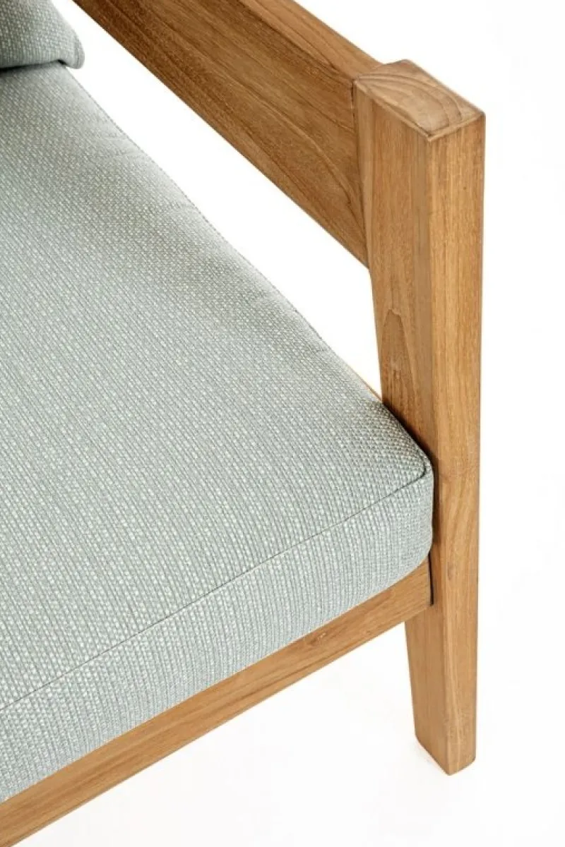 LEGNO TEAK FSC 100%, FINITURA NATURALE. CUSCINI SFODERABILI CON TESSUTO IDROREPELLENTE SUNPROOF OLEFIN (100% POLIPROPILENE). VITERIA IN ACCIAIO GALVANIZZATO. SI RACCOMANDA DI NON ESPORRE L’ARTICOLO ALLA LUCE DIRETTA DEL SOLE ED ALLE INTEMPERIE. QUESTO PRODOTTO È CARATTERIZZATO DALLA PRESENZA DI TASSELLI IN LEGNO DELLA STESSA NATURA. EVENTUALI FESSURE, CREPE O IMPERFEZIONI,