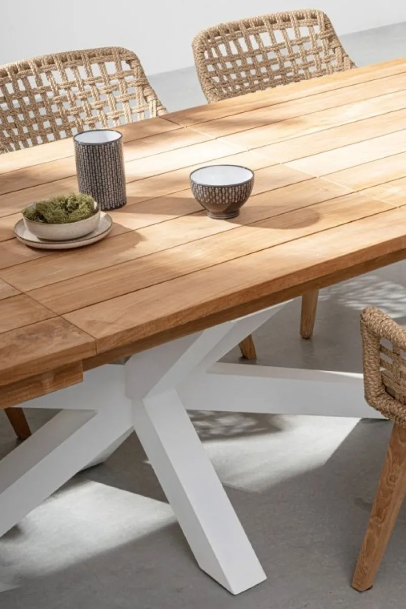 SEDUTA CON STRUTTURA IN ALLUMINIO VERNICIATA A POLVERE (POLIESTERE). INTRECCIO IN FIBRA SINTETICA VIRO CON ORIGINALE PIEGATURA A TRECCIA (EFFETTO PELLE). CUSCINO SEDUTA SFODERABILE IN TESSUTO IDROREPELLENTE SUNPROOF OLEFIN (100% POLIPROPILENE). GAMBE IN TEAK – SVLK (LEGNO CERTIFICATO PROVENIENTE DA FORESTE SOSTENIBILI). VITERIA IN ACCIAIO GALVANIZZATO. GAMBE DA ASSEMBLARE. ATTENZIONE: PRIMA DI PROCEDERE AL MONTAGGIO, ASSICURARSI CHE LA NUMERAZIONE SEDUTA-GAMBE COINCIDA.