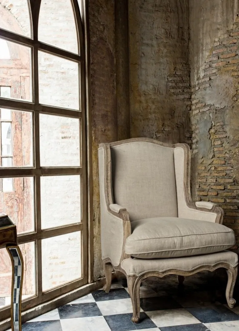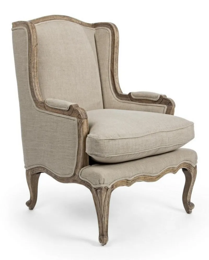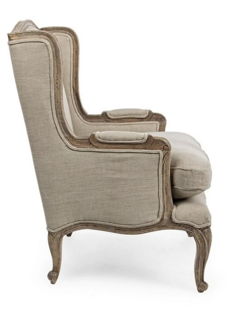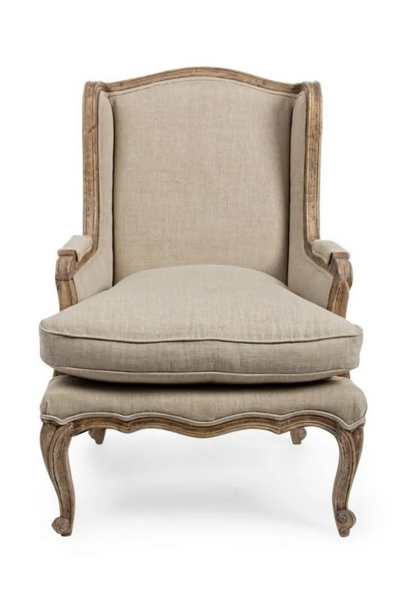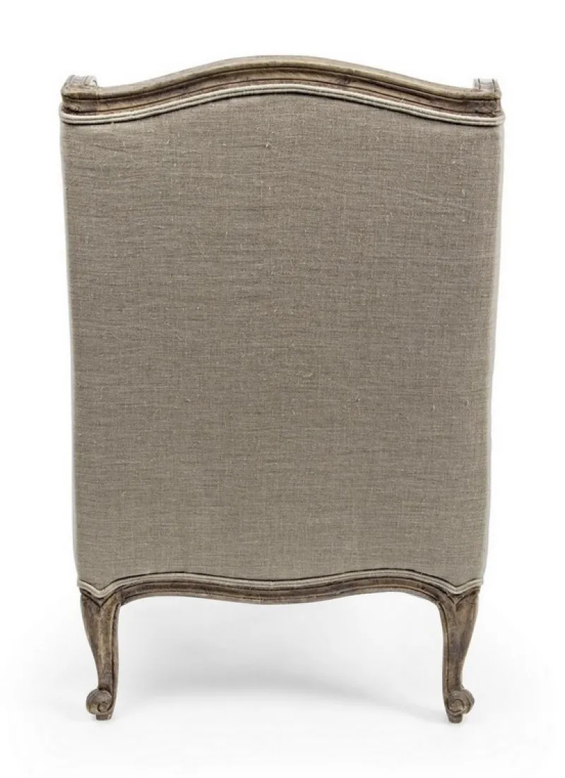 STRUTTURA IN LEGNO DI MANGO MASSICCIO INVECCHIATO. RIFINITURA CON VERNICE NITROCELLULOSA OPACA. RIVESTIMENTO IN LINO, CUSCINO SEDUTA SFODERABILE, IMBOTTITURA IN POLIESTERE. SOSPENSIONE CON CINGHIE ELASTICHE.