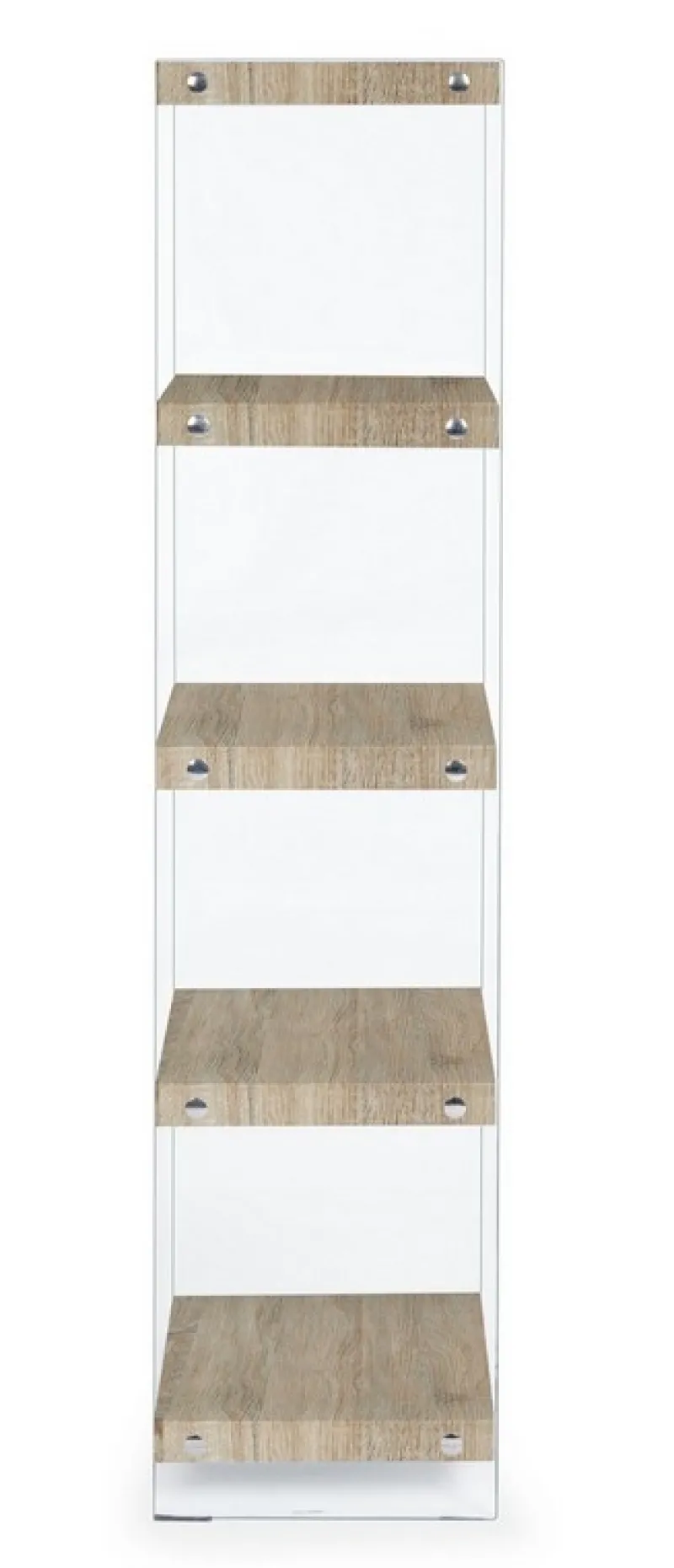 MENSOLE IN MDF RIVESTITE IN CARTA MELAMINICA EFFETTO LEGNO. FIANCHI IN VETRO TEMPERATO SPESSORE 12MM. DA ASSEMBLARE.