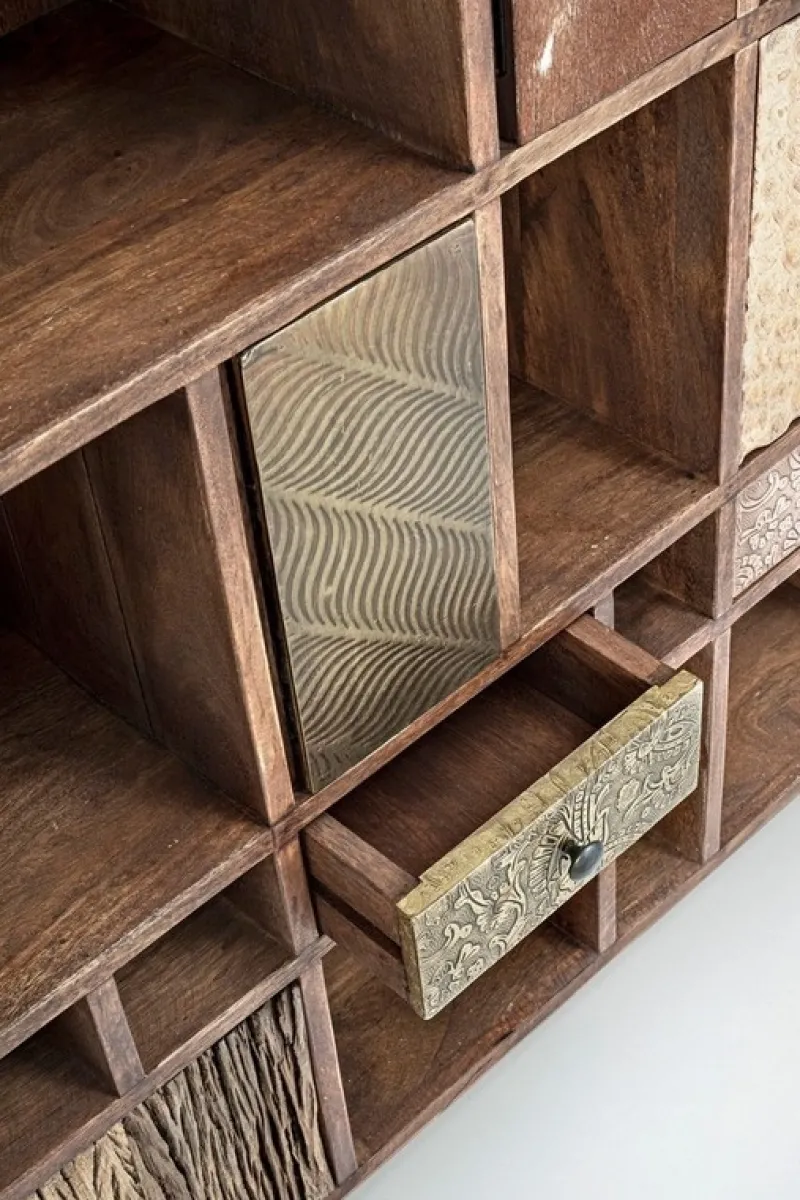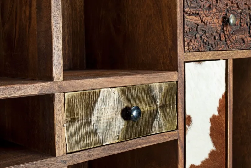 STRUTTURA IN LEGNO DI MANGO, SCHIENALE IN MDF. FRONTALE ANTE E CASSETTI IN LEGNO RICICLATO MANGO ED ACACIA CON APPLICAZIONI IN METALLO E PELLE. STRUTTURA CASSETTI IN MANGO ED ACACIA. FINITURA CON VERNICE A BASE D’ACQUA. MANIGLIE IN ACCIAIO.