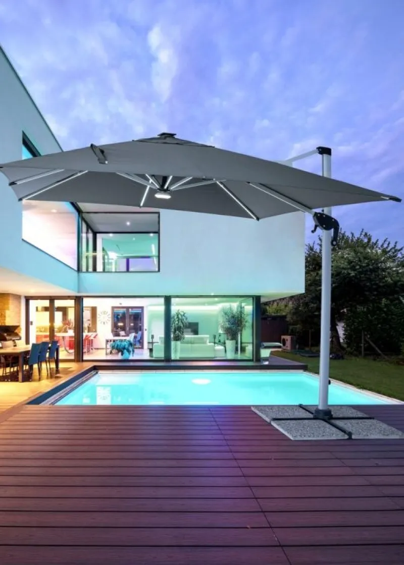STRUTTURA IN ALLUMINIO ANODIZZATO. PALO 77X53MM. 8 STECCHE 24X14MM CON LUCI A LED BIANCHE RICARICABILI CON PANNELLO SOLARE INCLUSO. TELO GRIGIO SCURO IN POLIESTERE 250GR/M2 CON RIVESTIMENTO IN PA (POLIAMMIDE) CON CAMINO ANTIVENTO. BASE A CROCE IN ACCIAIO. PALO GIREVOLE 360° CON PEDALINA. INCLINAZIONE VERTICALE CON IMPUGNATURA A 4 POSIZIONI. COMPRENSIVO DI COPRIOMBRELLONE. MARMETTE