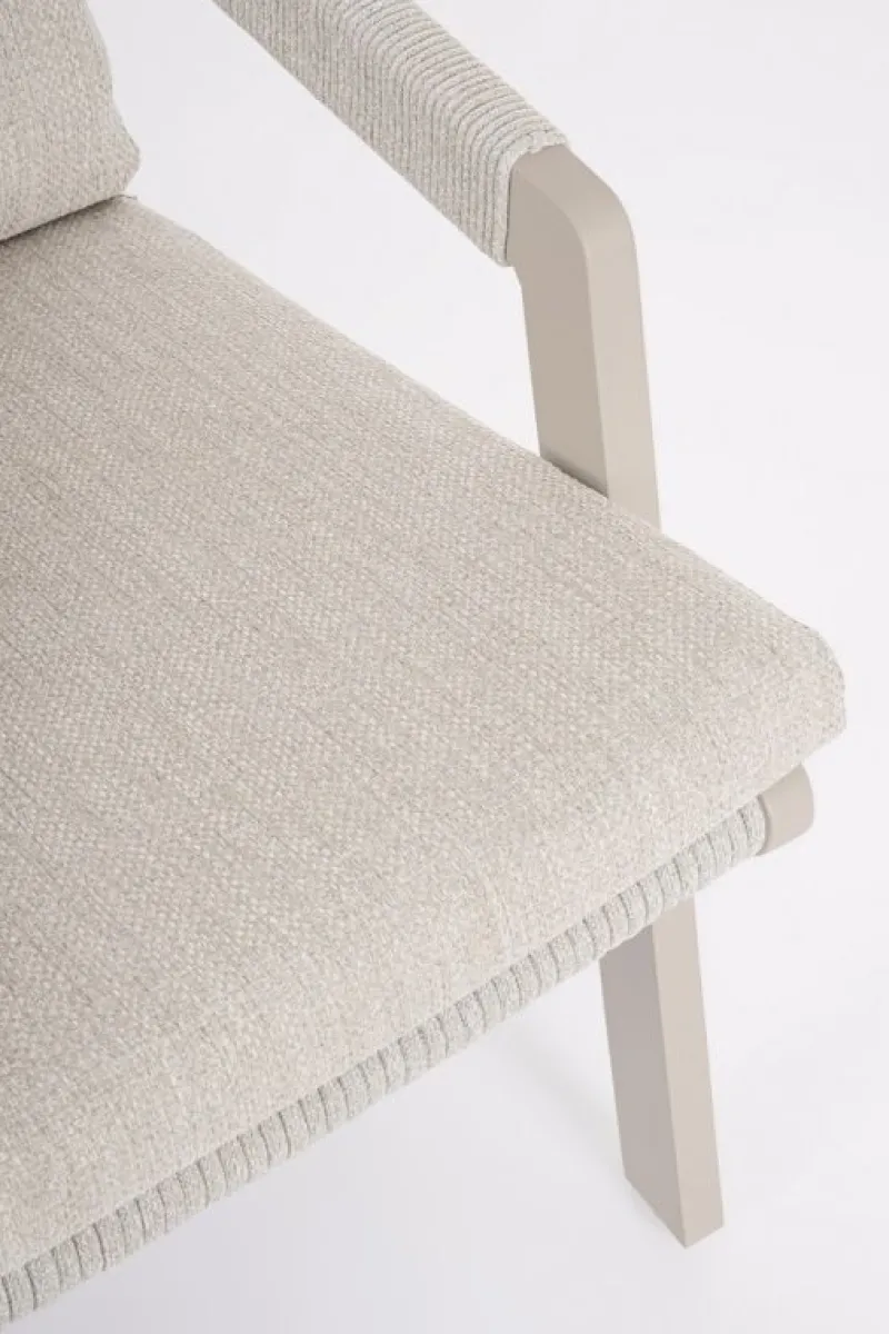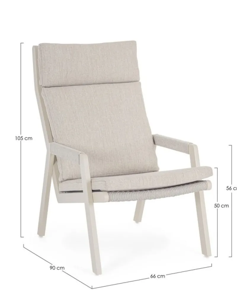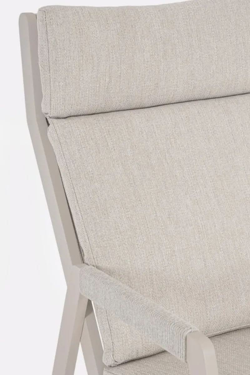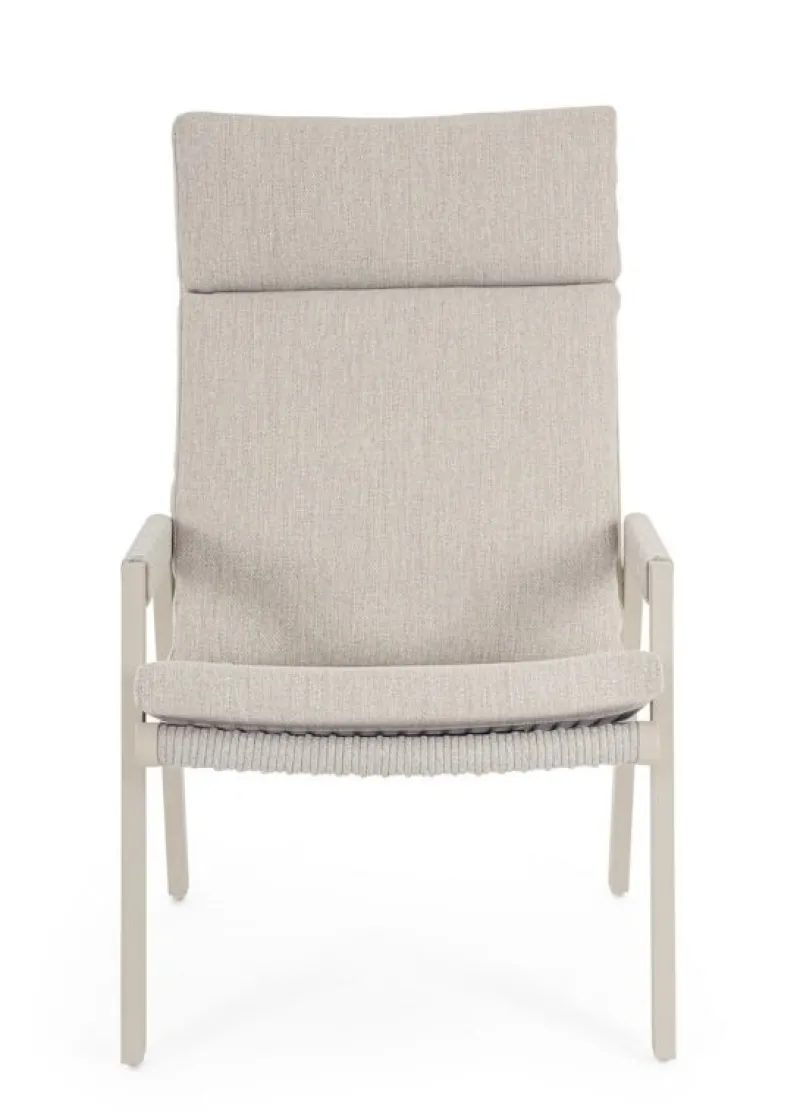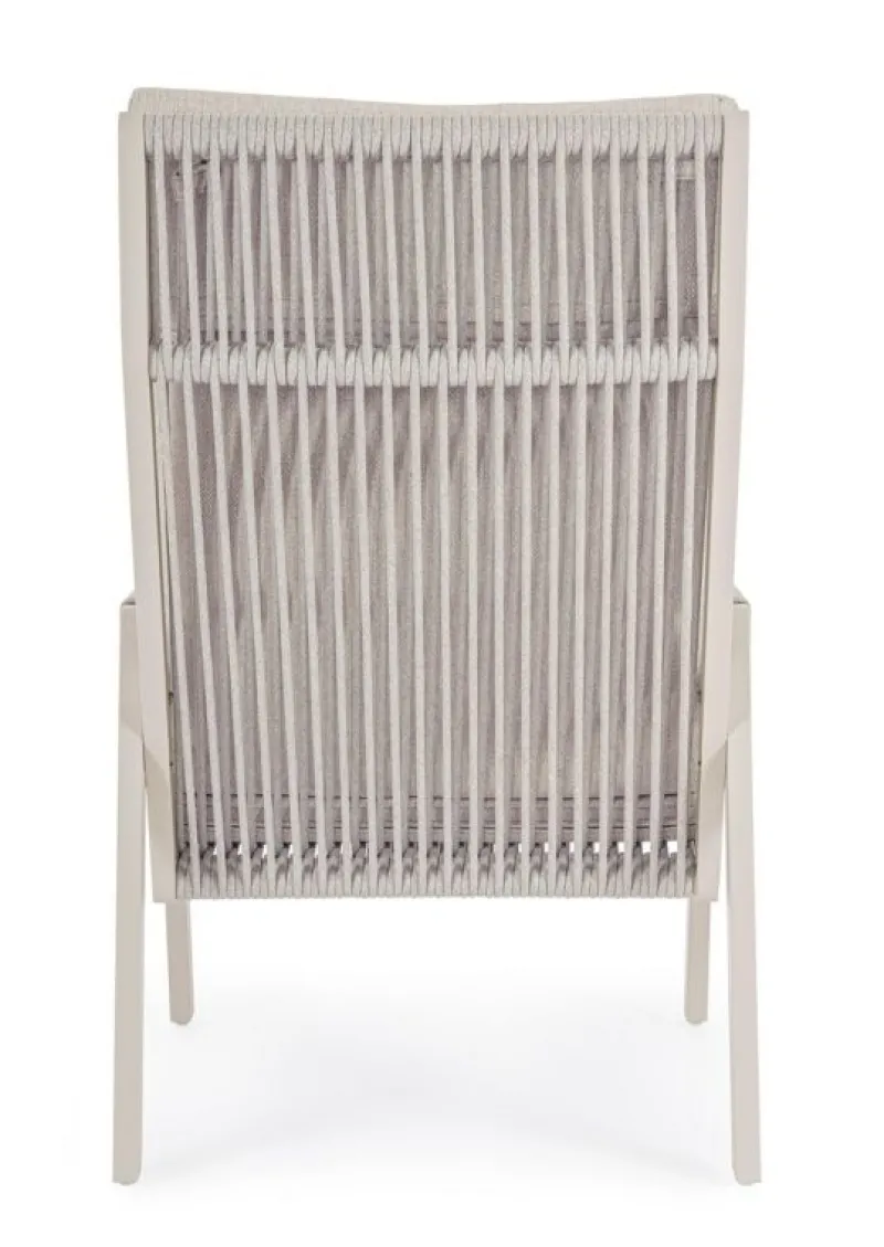 STRUTTURA IN ALLUMINIO VERNICIATO A POLVERE (POLIESTERE). SCHIENALE E BRACCIOLI CON INTRECCIO IN CORDE DI POLIESTERE. CUSCINO SEDUTA E SCHIENALE SFODERABILE CON TESSUTO IDROREPELLENTE OLEFIN (100% POLIPROPILENE). VITERIA IN ACCIAIO INOSSIDABILE. DA ASSEMBLARE.