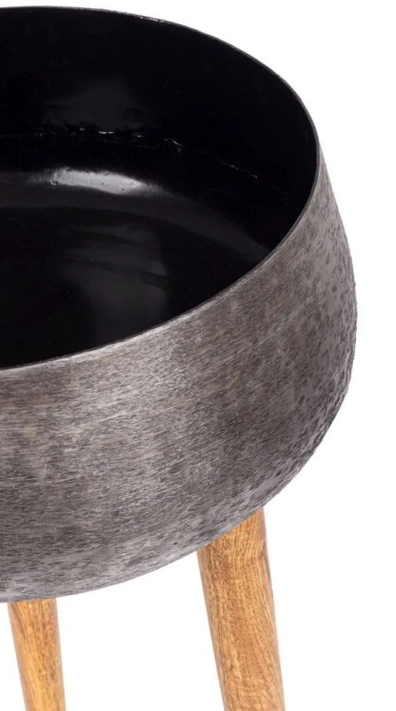 ALLUMINIO LAVORATO ARTIGIANALMENTE, FINITURA NERO SPAZZOLATO. GAMBE IN LEGNO DI MANGO. PRODOTTO FATTO A MANO. EVENTUALI VARIAZIONI DI COLORE, TONALITÀ O IMPERFEZIONI SONO DA CONSIDERARSI UNA CARATTERISTICA DI UNICITÀ. DA ASSEMBLARE.