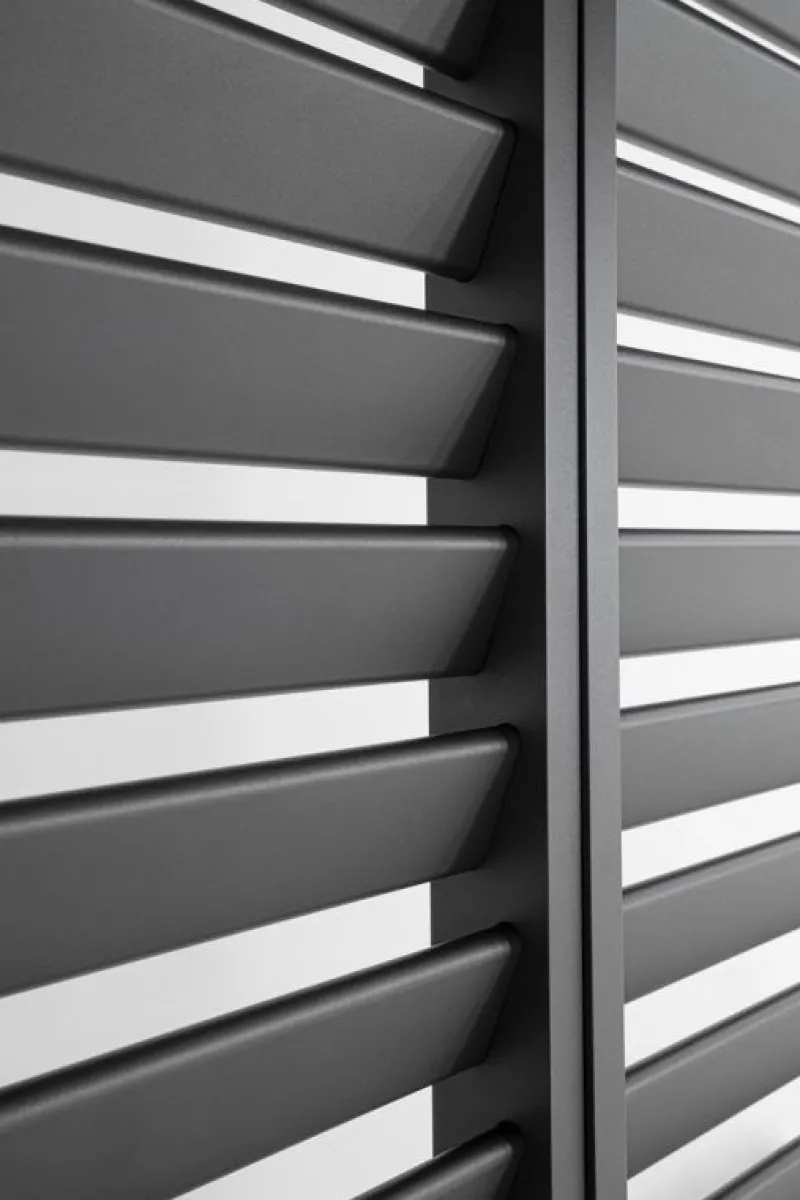 ALLUMINIO VERNICIATO A POLVERE (POLIESTERE). PALI PORTANTI 60X25MM, LAME FRANGISOLE FISSE 65X15MM. SISTEMA DI FISSAGGIO ALLA PERGOLA CON VITI AUTO-FORANTI. L’ARTICOLO PUO’ ESSERE USATO IN MODO MODULARE PER POTER RIEMPIRE UN INTERO LATO DA 3M OPPURE A COPERTURA DI UN SOLO ANGOLO. VITERIA IN ACCIAIO INOSSIDABILE. DA ASSEMBLARE.