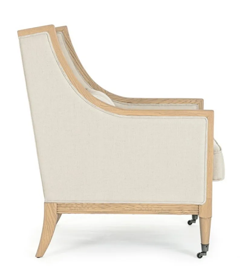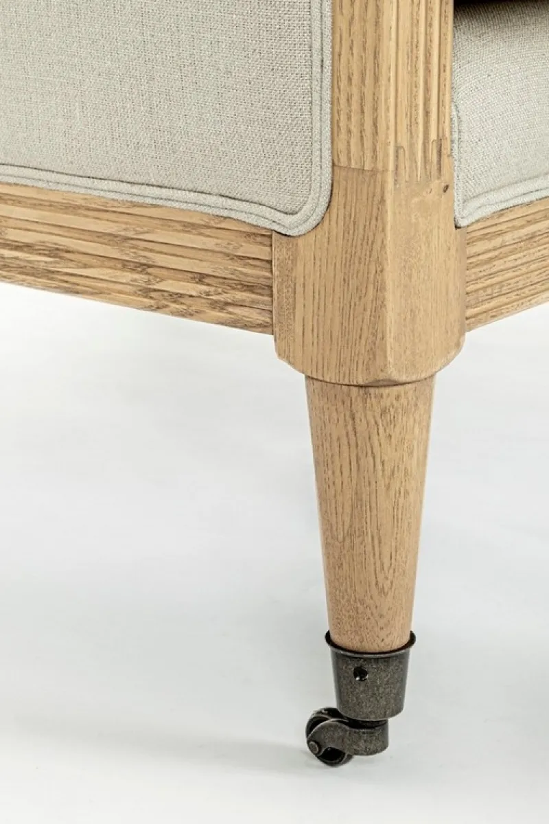 STRUTTURA IN LEGNO DI FRASSINO, RIVESTIMENTO 100% LINO. DENSITA’ IMBOTTITURA IN SCHIUMA POLIURETANICA SEDUTA 30KG/M3, SCHIENALE 25KG/M3.CUSCINI SFODERABILI. COMPRENSIVO DI RUOTE ANTERIORI IN ACCIAIO ZINCATO.