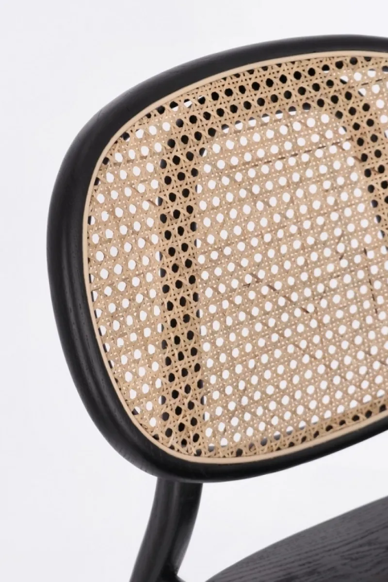STRUTTURA IN LEGNO DI OLMO, SCHIENALE CON INTRECCIO IN RATTAN, FINITURA POLIURETANICA. IMBALLO SENZA CARTONE.