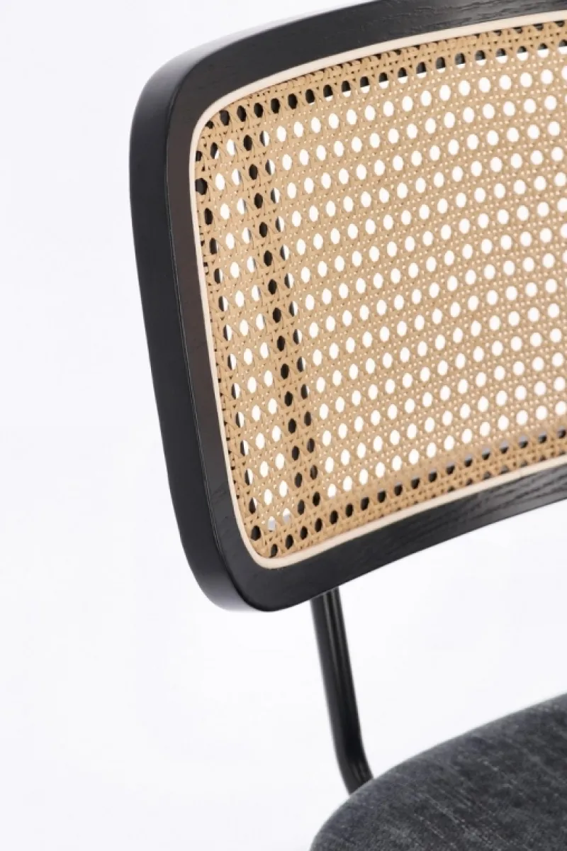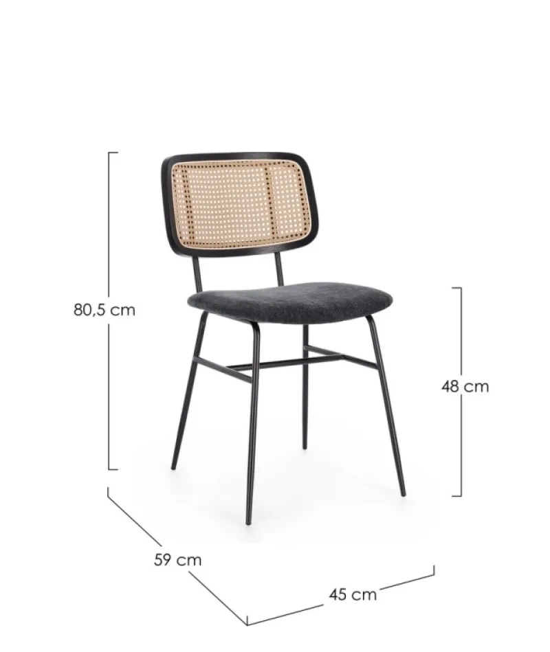 STRUTTURA IN ACCIAIO VERNICIATA A POLVERE EPOSSIDICA. SEDUTA IN COMPENSATO CON RIVESTIMENTO IN 100% POLIESTERE. SCHIENALE IN COMPENSATO CON LAVORAZIONE IN FIBRA SINTETICA EFFETTO RATTAN. DA ASSEMBLARE.