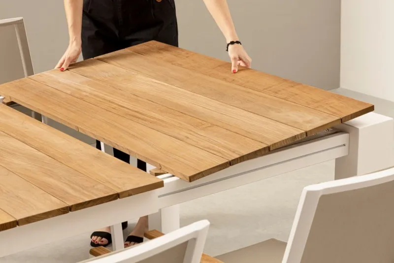 STRUTTURA IN ALLUMINIO, VERNICIATO A POLVERE (POLIESTERE). PIANO IN TEAK. ALLUNGABILE CON APERTURA TELESCOPICA. PROLUNGHE ESTERNE CON ALLOGGIO SOTTO IL PIANO. VITERIA IN ACCIAIO INOSSIDABILE. PIEDINI IN PLASTICA REGOLABILI. GAMBE DA ASSEMBLARE. ATTENZIONE CODICE IN ABBINAMENTO.