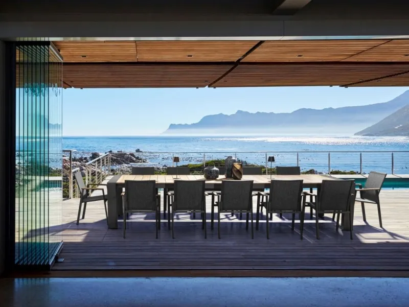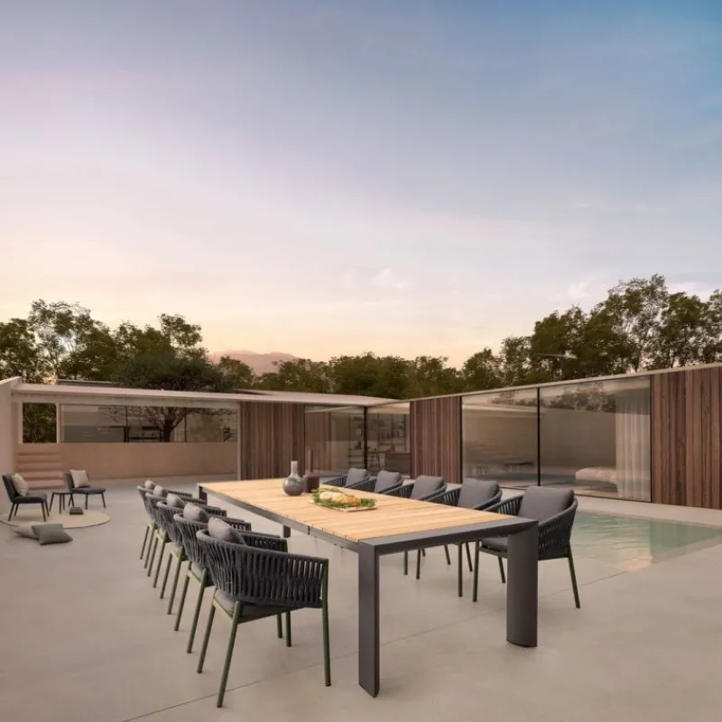 STRUTTURA IN ALLUMINIO, VERNICIATO A POLVERE (POLIESTERE). PIANO IN TEAK. ALLUNGABILE CON APERTURA TELESCOPICA. PROLUNGHE ESTERNE CON ALLOGGIO SOTTO IL PIANO. VITERIA IN ACCIAIO INOSSIDABILE. PIEDINI IN PLASTICA REGOLABILI. GAMBE DA ASSEMBLARE. ATTENZIONE CODICE IN ABBINAMENTO.