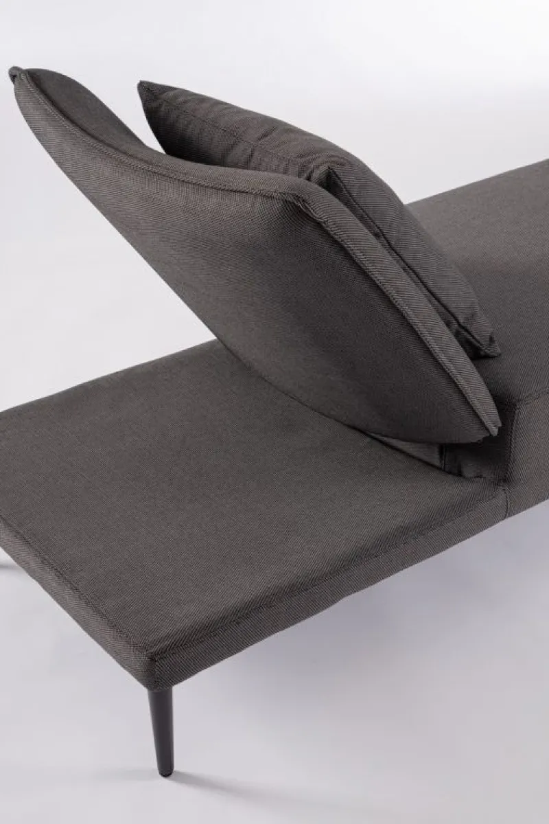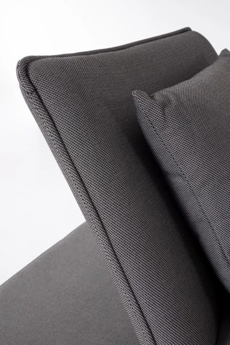 STRUTTURA IN ALLUMINIO. SEDUTA E SCHIENALE (RECLINABILE IN LIBERA POSIZIONE) NON SFODERABILI IN TESSUTO PER ESTERNO IN OLEFIN (100% POLIPROPILENE, 285GR/M2), IDROREPELLENTE E RESISTENTE AI RAGGI UV (GRADO 7), IMPERMEABILIZZATO INTERNAMENTE CON RIVESTIMENTO IN TESSUTO (POLIURETANO). IMBOTTITURA IN SCHIUMA POLIURETANICA, DENSITA’ 40KG/M3. INCLUSO DI