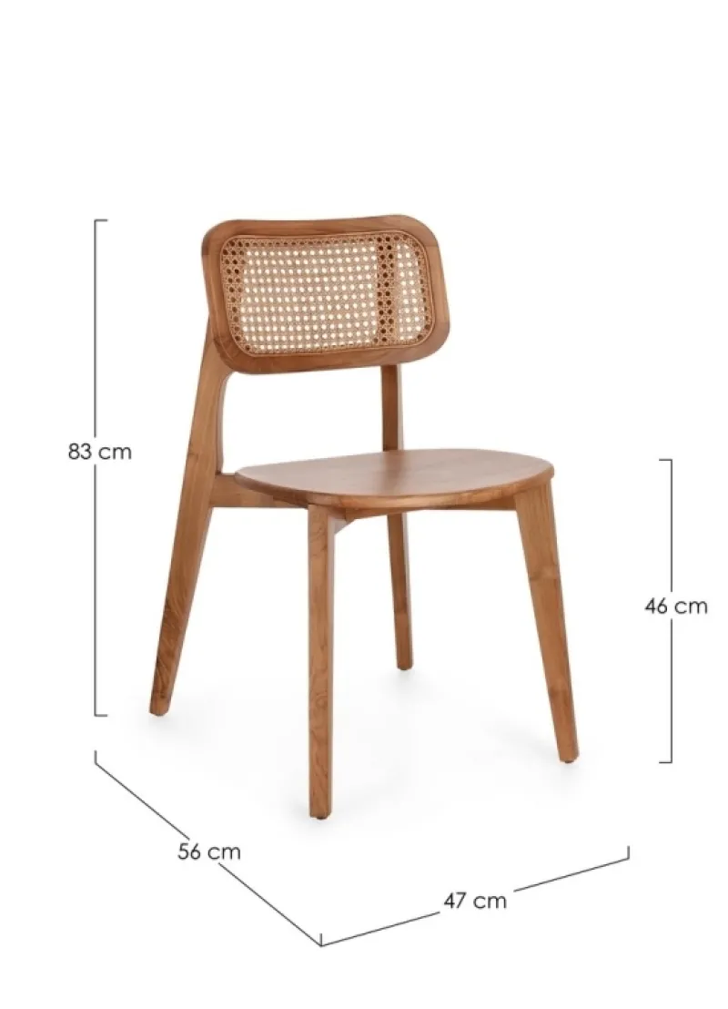 LEGNO TEAK, FINITURA NATURALE CON VERNICE A BASE DI NITROCELLULOSA. SCHIENALE CON INTRECCIO IN RATTAN. SOLO PER USO INTERNO.
