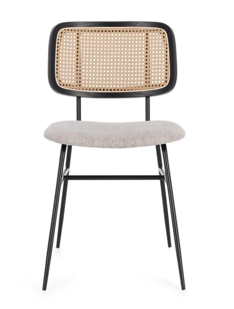 STRUTTURA IN ACCIAIO VERNICIATA A POLVERE EPOSSIDICA. SEDUTA IN COMPENSATO CON RIVESTIMENTO IN 100% POLIESTERE. SCHIENALE IN COMPENSATO CON LAVORAZIONE IN FIBRA SINTETICA EFFETTO RATTAN. DA ASSEMBLARE.