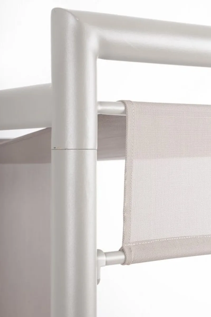 STRUTTURA IN ALLUMINIO, VERNICIATO A POLVERE (POLIESTERE). SEDUTA LETTINI IN TEXTILENE, RECLINABILE IN ENTRAMBE LE DIREZIONI IN 4 POSIZIONI. TETTUCCIO PARASOLE IN TEXTILENE SCORREVOLE IN 3 POSIZIONI. CUSCINI SFODERABILI CON TESSUTO IDROREPELLENTE OLEFIN (100% POLIPROPILENE). VITERIA IN ACCIAIO INOSSIDABILE. DA ASSEMBLARE.