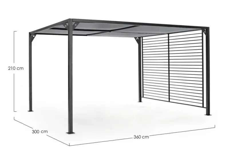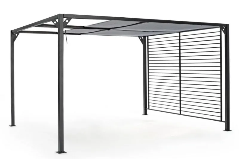STRUTTURA IN ALLUMINIO VERNICIATO A POLVERE (POLIESTERE). PALI 65X65MM, TETTUCCIO SUPERIORE SCORREVOLE IN TEXTILENE GRIGIO SCURO. DA ASSEMBLARE.