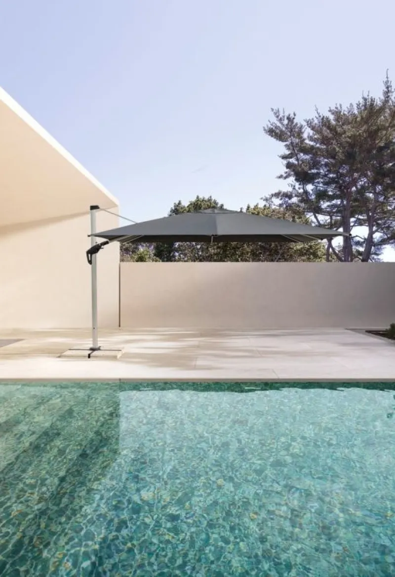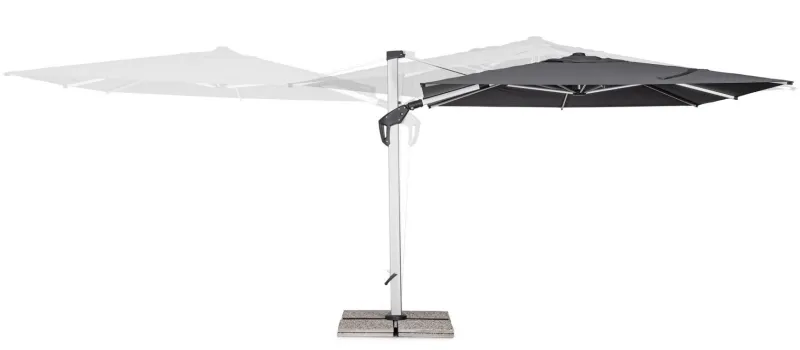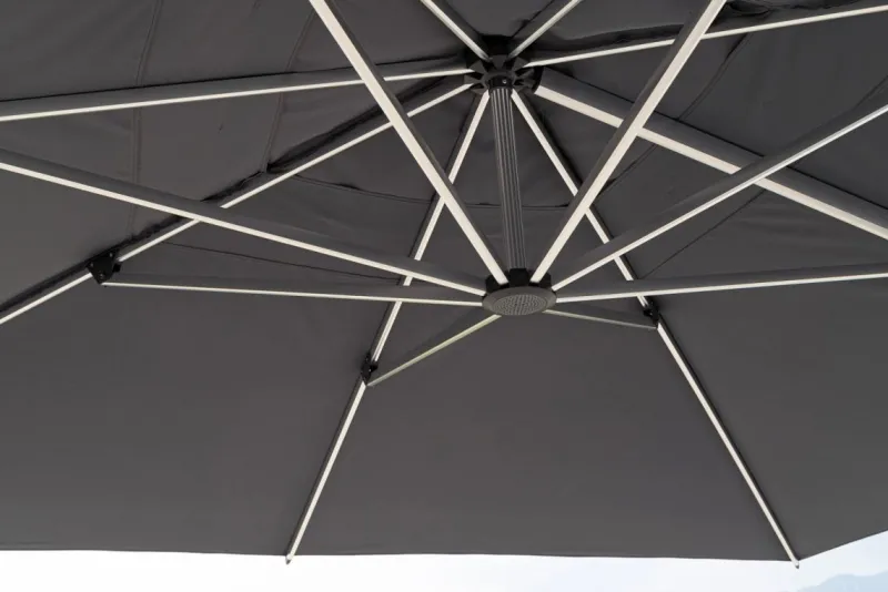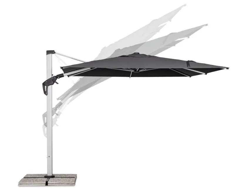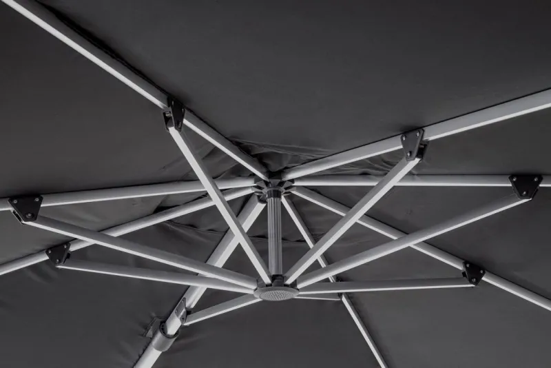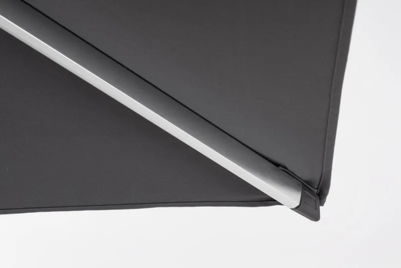 STRUTTURA IN ALLUMINIO ANODIZZATO. PALO 102×65.5MM. 8 STECCHE 30X18.5MM. TELO COLOR GRIGIO SCURO IN POLIESTERE 250GR/M2 CON RIVESTIMENTO IN PA (POLIAMMIDE) CON CAMINO ANTIVENTO. BASE A CROCE IN ACCIAIO. PALO GIREVOLE 360° MANUALMENTE . INCLINAZIONE VERTICALE CON IMPUGNATURA A 6 POSIZIONI. DOTATO DI SISTEMA PER INCLINAZIONE OMBRELLO DESTRA-SINISTRA. COMPRENSIVO DI