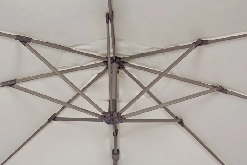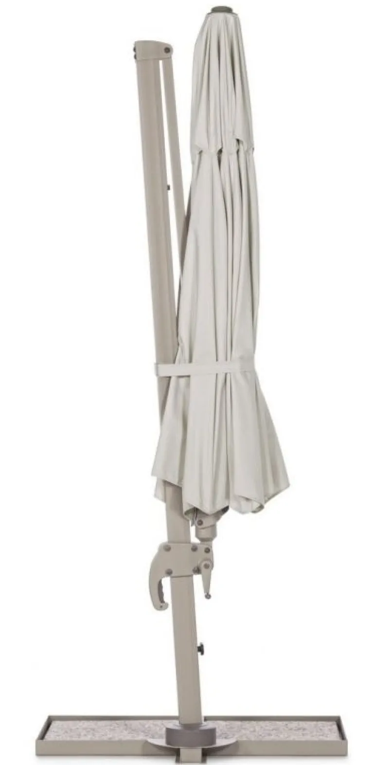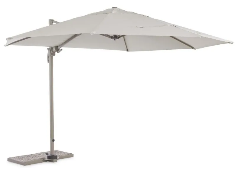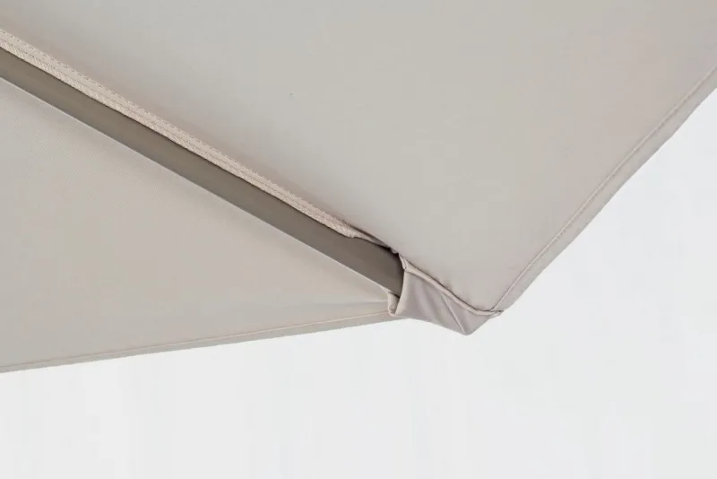 STRUTTURA IN ALLUMINIO VERNICIATA A POLVERE (POLIESTERE). PALO 50x78x1.6MM.8 STECCHE 23X12x1.0MM. TELO COLOR SABBIA IN POLIESTERE 200GR/M2 CON RIVESTIMENTO IN PA (POLIAMMIDE) CON CAMINO ANTIVENTO. BASE LATERALE IN ACCIAIO. PALO GIREVOLE 360° CON PEDALINA. INCLINAZIONE VERTICALE CON IMPUGNATURA A 5 POSIZIONI. DOTATO DI MANIGLIA PER INCLINAZIONE OMBRELLO DESTRA-SINISTRA.MARMETTE NON