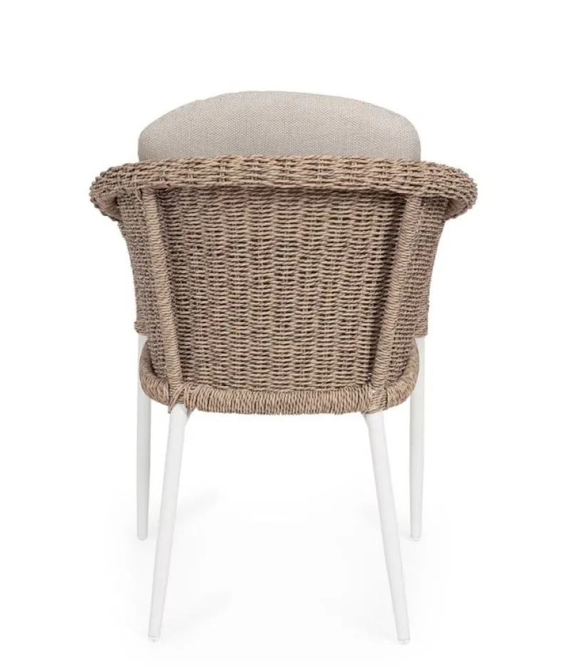 STRUTTURA E GAMBE IN ALLUMINIO VERNICIATE A POLVERE (POLIESTERE). SEDUTA RIVESTITA IN FIBRA SINTETICA (TONDA 3.5MM). CUSCINI SEDUTA E SCHIENALE SFODERABILI CON TESSUTO IDROREPELLENTE OLEFIN (100% POLIPROPILENE). IMPILABILE.