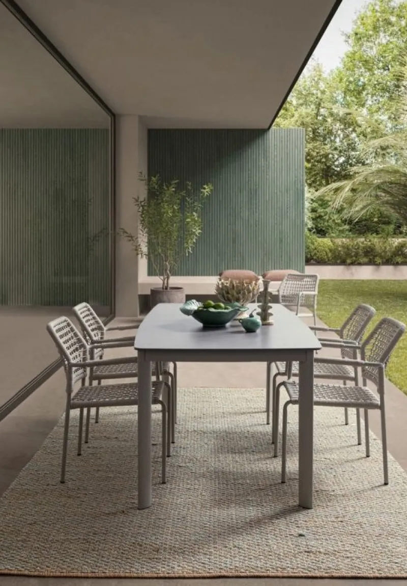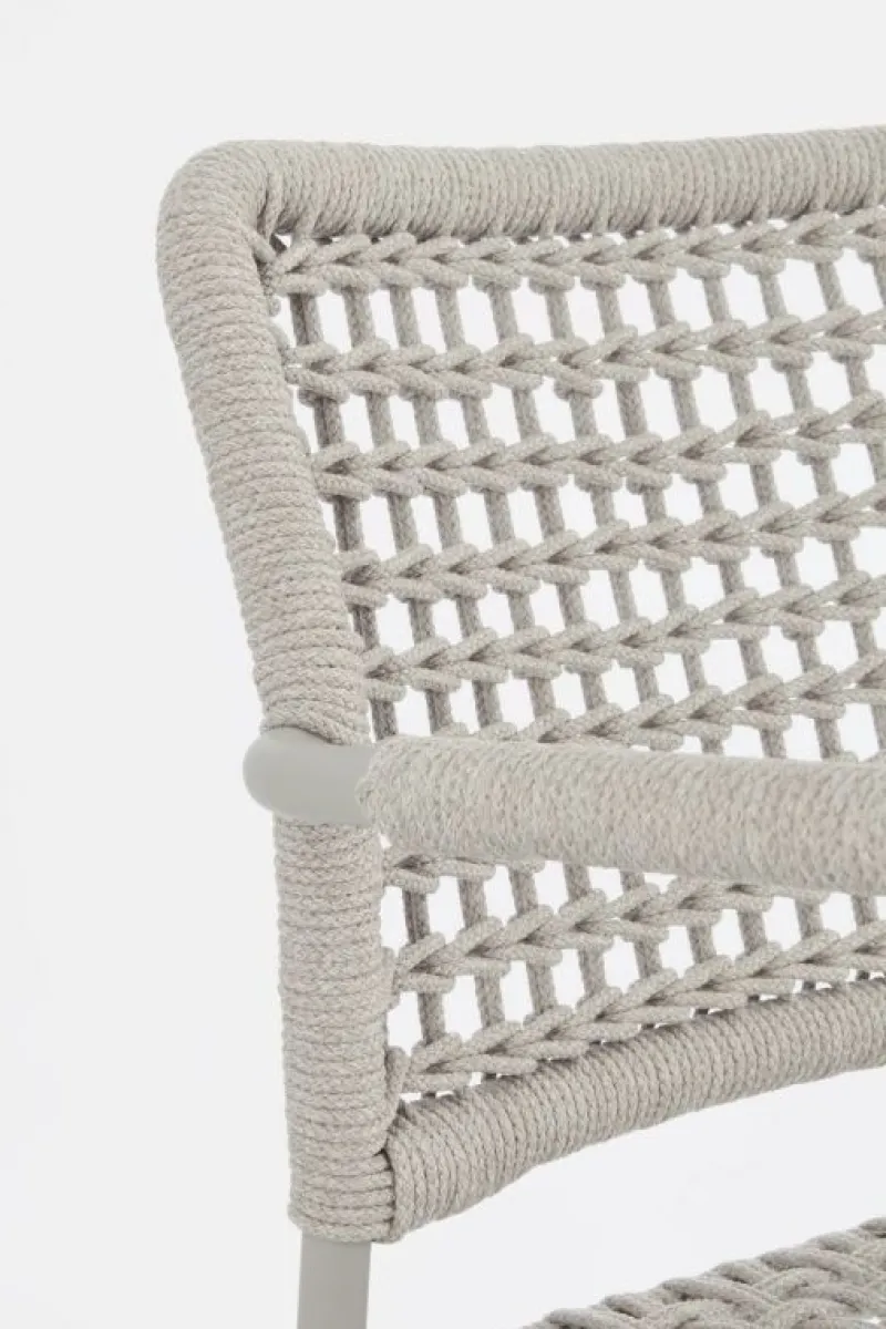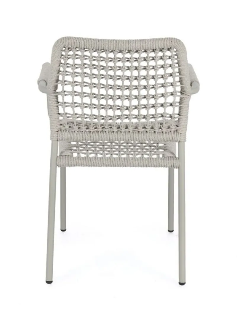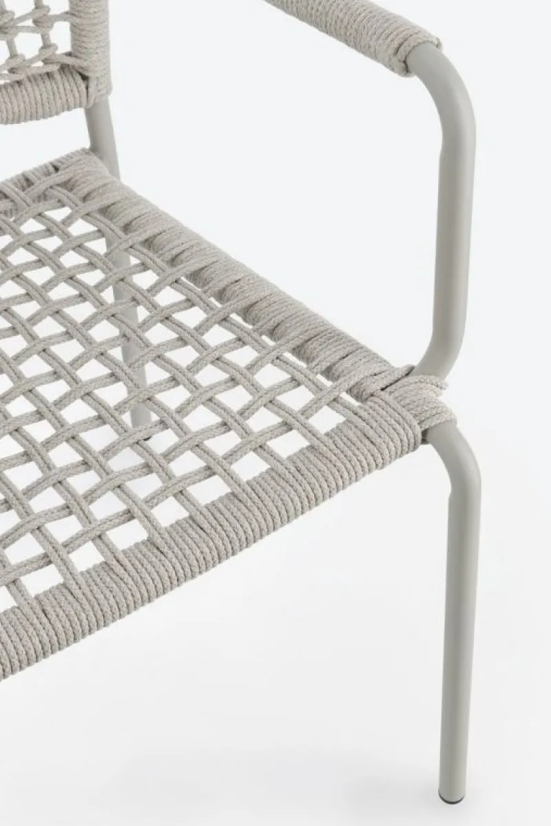 STRUTTURA IN ALLUMINIO VERNICIATA A POLVERE (POLIESTERE). INTRECCIO PER ESTERNO IN CORDA POLIESTERE. IMPILABILE. IMBALLO SENZA CARTONE.