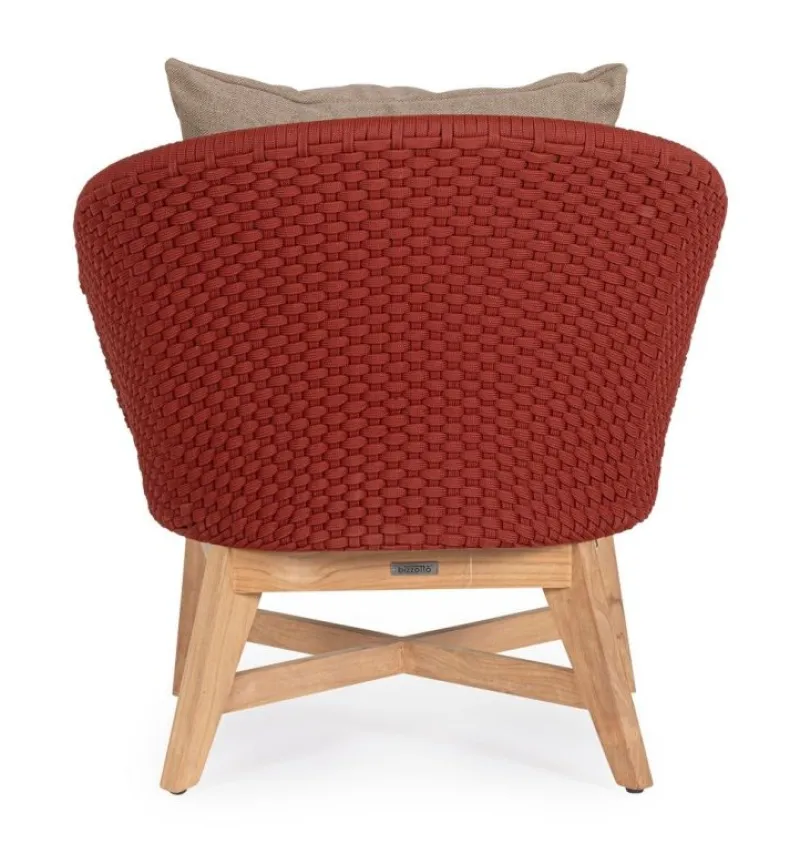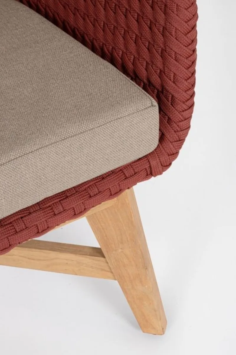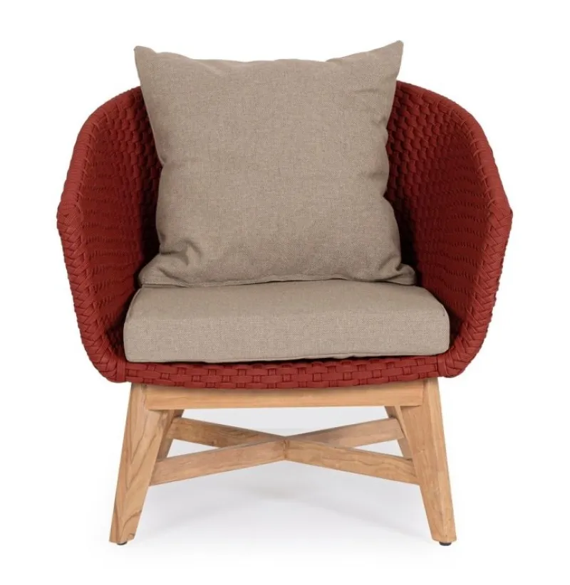 SEDUTA CON STRUTTURA IN ALLUMINIO VERNICIATA A POLVERE (POLIESTERE). INTRECCIO IN CORDA OLEFIN (100% POLIPROPILENE). CUSCINO SEDUTA E SCHIENALE SFODERABILE CON TESSUTO IDROREPELLENTE SUNPROOF OLEFIN (100% POLIPROPILENE). GAMBE IN TEAK – SVLK (LEGNO CERTIFICATO PROVENIENTE DA FORESTE SOSTENIBILI). VITERIA IN ACCIAIO GALVANIZZATO. GAMBE DA ASSEMBLARE. ATTENZIONE: PRIMA DI PROCEDERE AL MONTAGGIO, ASSICURARSI CHE LA NUMERAZIONE SEDUTA-GAMBE COINCIDA.