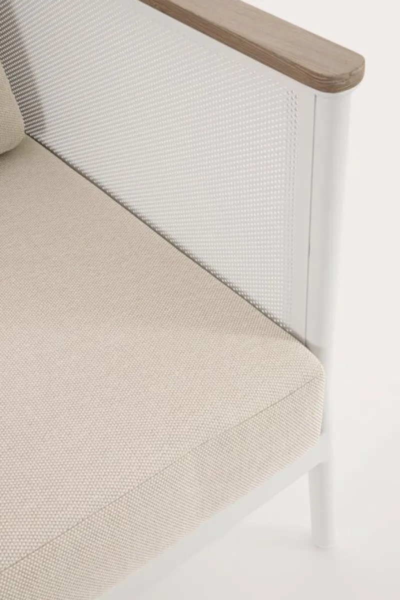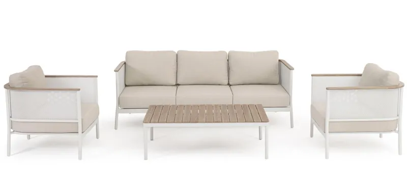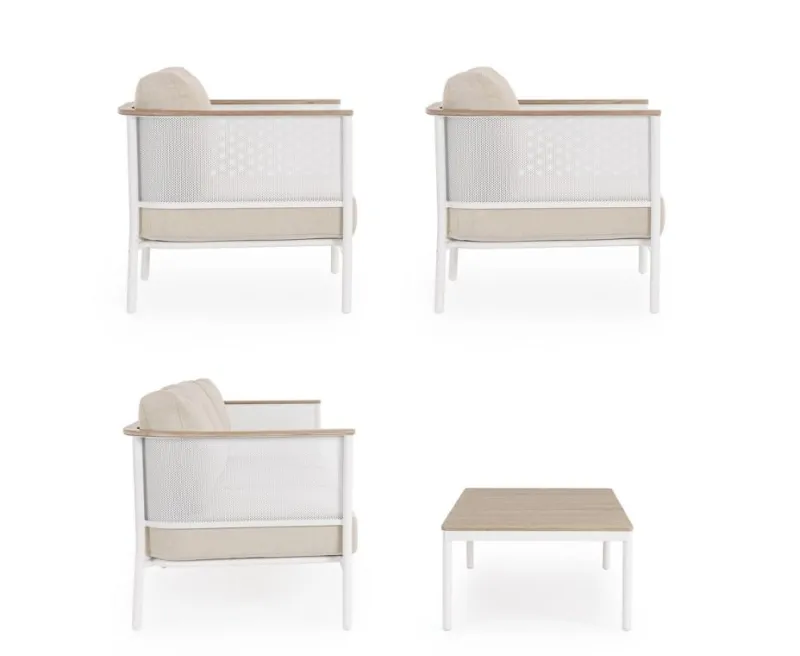 STRUTTURA IN ALLUMINIO VERNICIATO A POLVERE (POLIESTERE). BRACCIOLI E PIANO TAVOLINO IN ALLUMINIO CON VERNICIATURA EFFETTO LEGNO. CUSCINI SEDUTA E SCHIENALE SFODERABILI CON TESSUTO IDROREPELLENTE OLEFIN (100% POLIPROPILENE). GAMBE TAVOLINO (VITERIA IN ACCIAIO INOSSIDABILE) DA ASSEMBLARE.