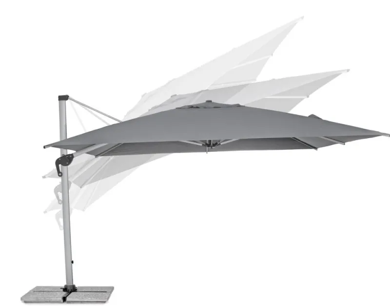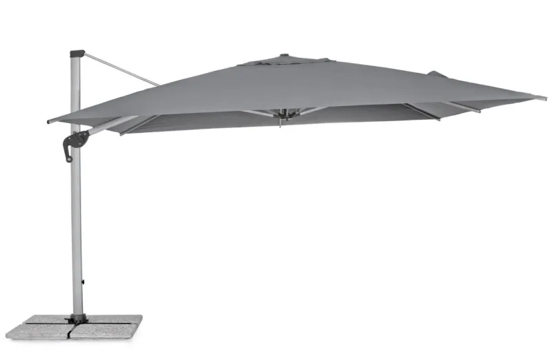 STRUTTURA IN ALLUMINIO ANODIZZATO PALO 93X57MM. 8 STECCHE 28X18MM. TELO GRIGIO SCURO IN POLIESTERE 250GR/M2 CON RIVESTIMENTO IN PA (POLIAMMIDE) CON CAMINO ANTIVENTO. BASE A CROCE IN ACCIAIO. PALO GIREVOLE 360° CON PEDALINA. INCLINAZIONE VERTICALE CON IMPUGNATURA A 5 POSIZIONI. COMPRENSIVO DI COPRIOMBRELLONE. MARMETTE NON INCLUSE. PREDISPOSIZIONE LAMPADA LED