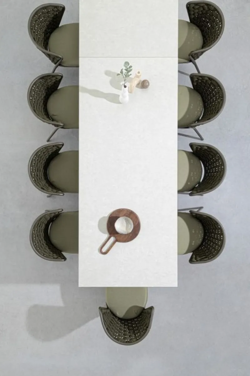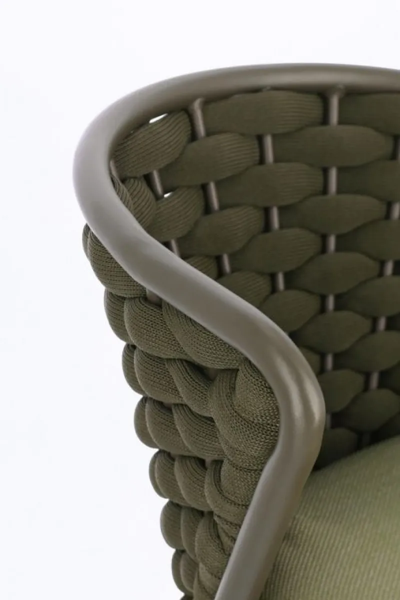 STRUTTURA IN ALLUMINIO VERNICIATO A POLVERE (POLIESTERE). INTRECCIO IN CORDA DI TEXTILENE CON IMBOTTITURA IN GOMMA NITRILICA. CUSCINO SEDUTA SFODERABILE CON TESSUTO IDROREPELLENTE OLEFIN (100% POLIPROPILENE). IMPILABILE.