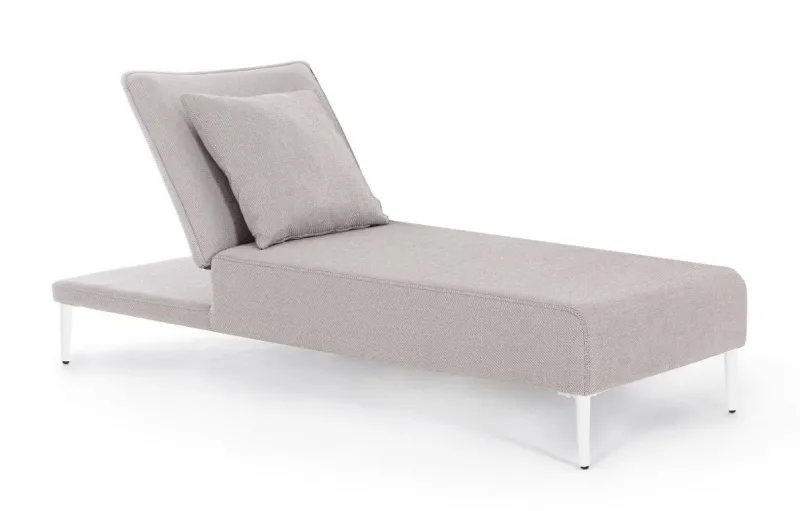 STRUTTURA IN ALLUMINIO. SEDUTA E SCHIENALE (RECLINABILE IN LIBERA POSIZIONE) NON SFODERABILI IN TESSUTO PER ESTERNO IN OLEFIN (100% POLIPROPILENE, 285GR/M2), IDROREPELLENTE E RESISTENTE AI RAGGI UV (GRADO 7), IMPERMEABILIZZATO INTERNAMENTE CON RIVESTIMENTO IN TESSUTO (POLIURETANO). IMBOTTITURA IN SCHIUMA POLIURETANICA, DENSITA’ 40KG/M3. INCLUSO DI