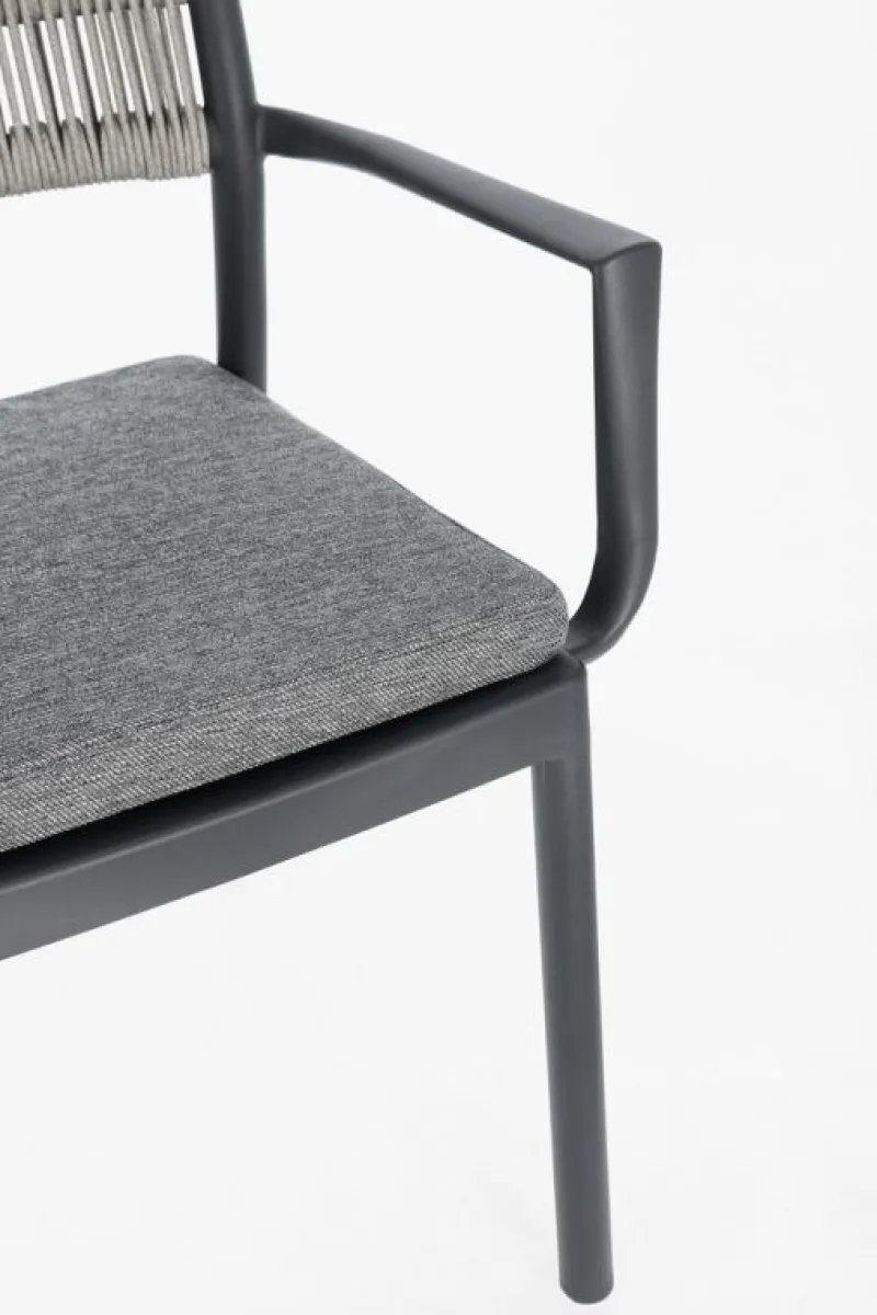 POLIPROPILENE (PP), RESISTENTE AI RAGGI UV. SCHIENALE CON INTRECCIO IN CORDA DI POLIESTERE. CUSCINO SEDUTA SFODERABILE CON TESSUTO IDROREPELLENTE POLIESTERE. IMPILABILE.