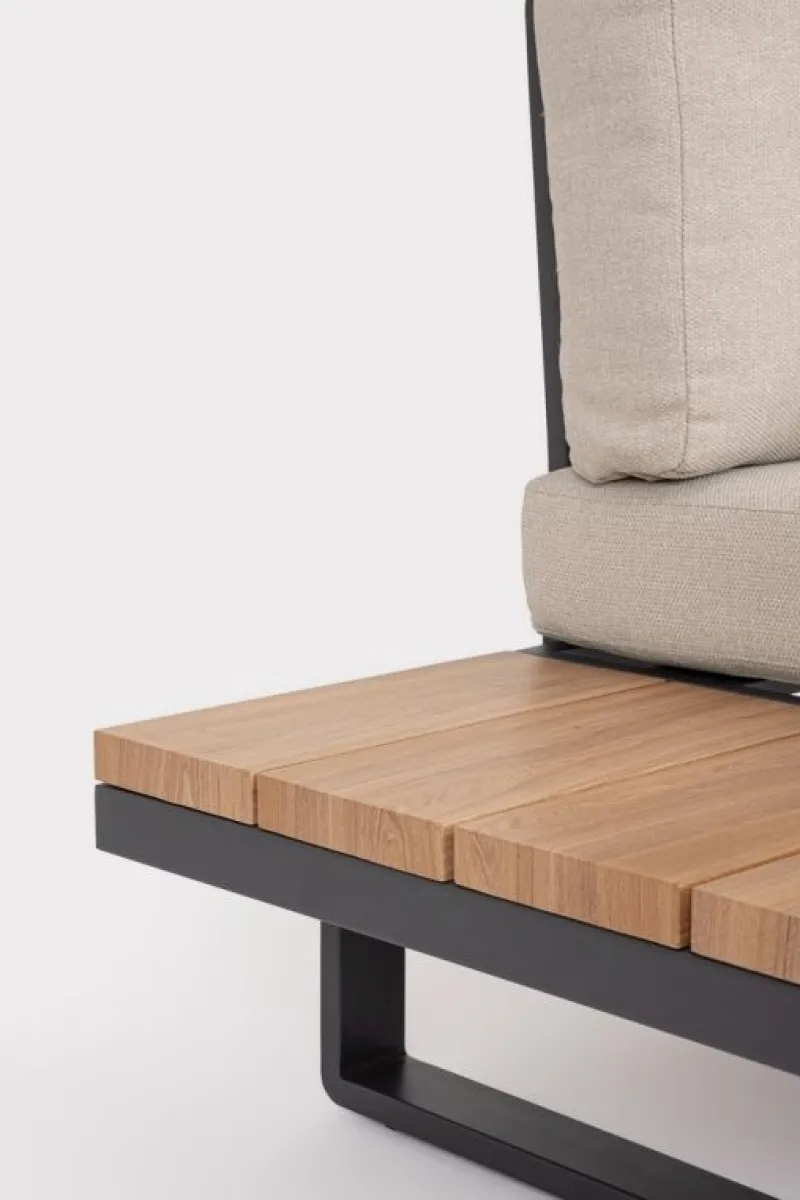 STRUTTURA IN ALLUMINIO VERNICIATO A POLVERE (POLIESTERE). LATERALI DIVANO E PIANO TAVOLINO IN ALLUMINIO CON VERNICIATURA EFFETTO LEGNO. CUSCINI SEDUTA E SCHIENALE SFODERABILI CON TESSUTO IDROREPELLENTE OLEFIN (100% POLIPROPILENE). VITERIA IN ACCIAIO INOSSIDABILE. PIEDINI REGOLABILI. DA ASSEMBLARE.